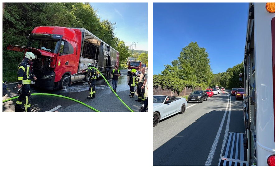 Noch während der Aufräumarbeiten an der Einsatzstelle in der Bockseifer Straße wurden die Einsätzkräfte aus Büschergrund und Freudenberg sowie die Polizei zu einem Lkw-Brand auf die Peimbachstraße alarmiert. Am Einsatzort eingetroffen stellte Einsatzleiter Thomas Münker schnell fest, dass der neuwertige Sattelzug glücklicherweise zwar noch nicht brannte, aber dass die Zugmaschine des aus dem oberbergischen Waldbröl stammenden Lkw durch zwei völlig überhitzte Achsen und bereits qualmende Bremsen an der Weiterfahrt gehindert wurde. Die lange Abfahrt der L512 von Löffelberg nach Büschergrund hatte offenbar für die Überhitzung der Bremsen des schwer beladenen Sattelzuges gesorgt.