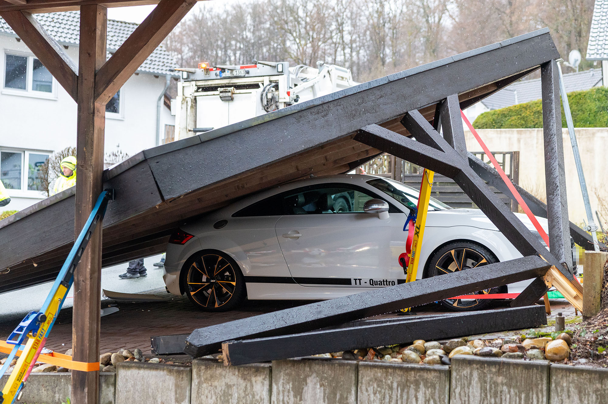 Glücklicherweise befand sich zum Zeitpunkt des Vorfalls niemand unter dem Carport. Eingestürzt war dies nicht etwa durch Materialermüdung, sondern, weil ein Müllwagen beim Rangieren mit dem Aufbau dagegen gekommen war. Dessen 33-jährige Fahrer befuhr rückwärts die Tillmann-Siebel-Straße und musste nach eigener Aussage um ein am Fahrbahnrand geparkten Pkw umherfahren. Dabei übersah er offenbar das Dach des Carports.