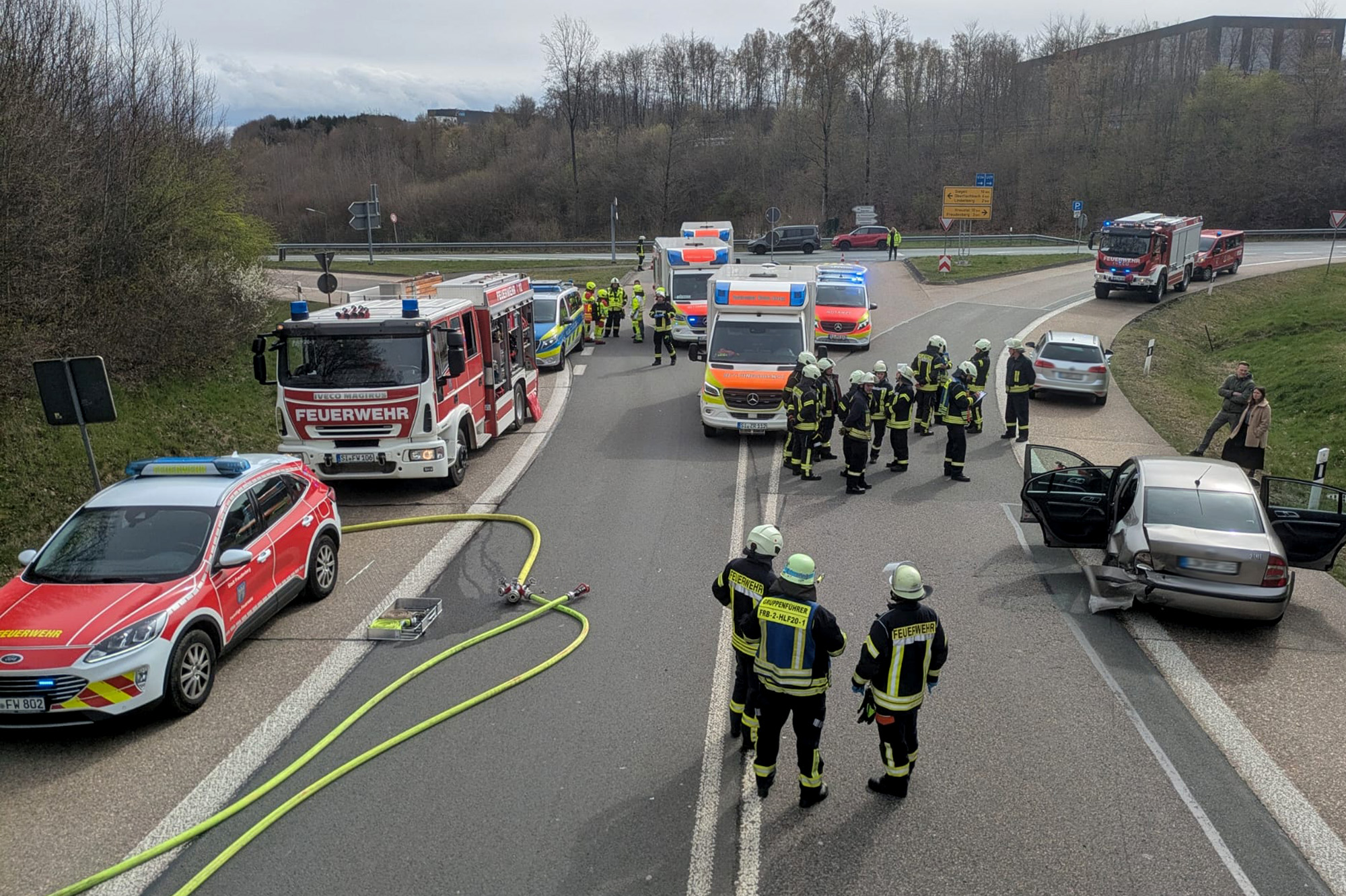 Büschergrund. Zu einem Verkehrsunfall mussten die Feuerwehren aus Büschergrund und Oberholzklau zur Kaffeezeit am Ostersonntag ausrücken. Kurz nach 15 Uhr ging der Notruf ein und die Einsatzkräfte machten sich auf den Weg zur Einsatzstelle an der Autobahnabfahrt Freudenberg aus Richtung Siegen kommend.