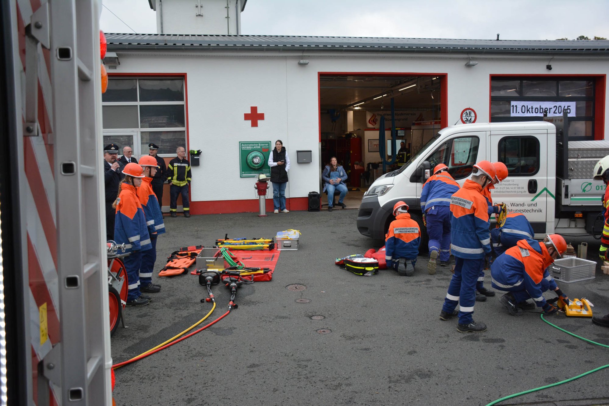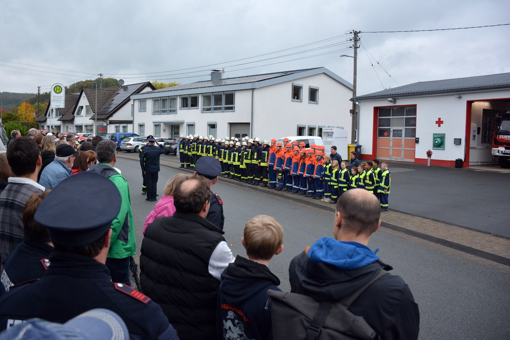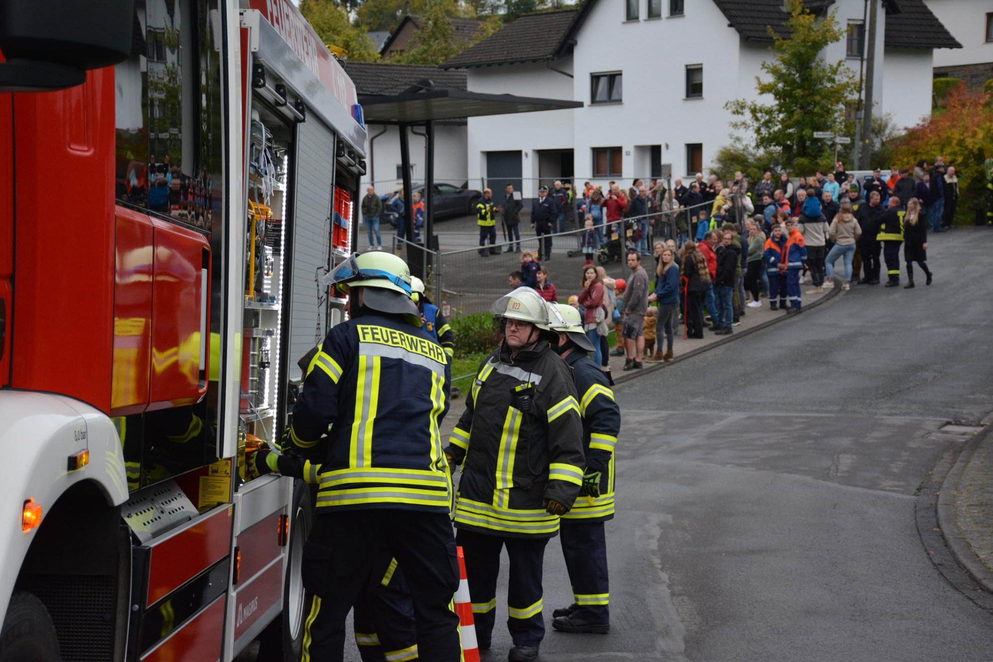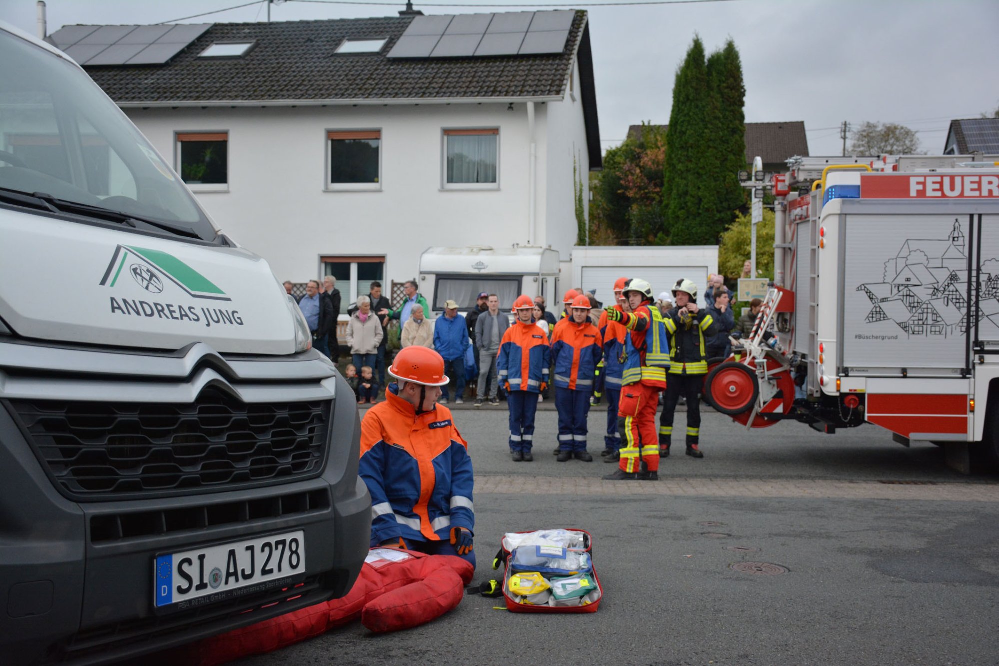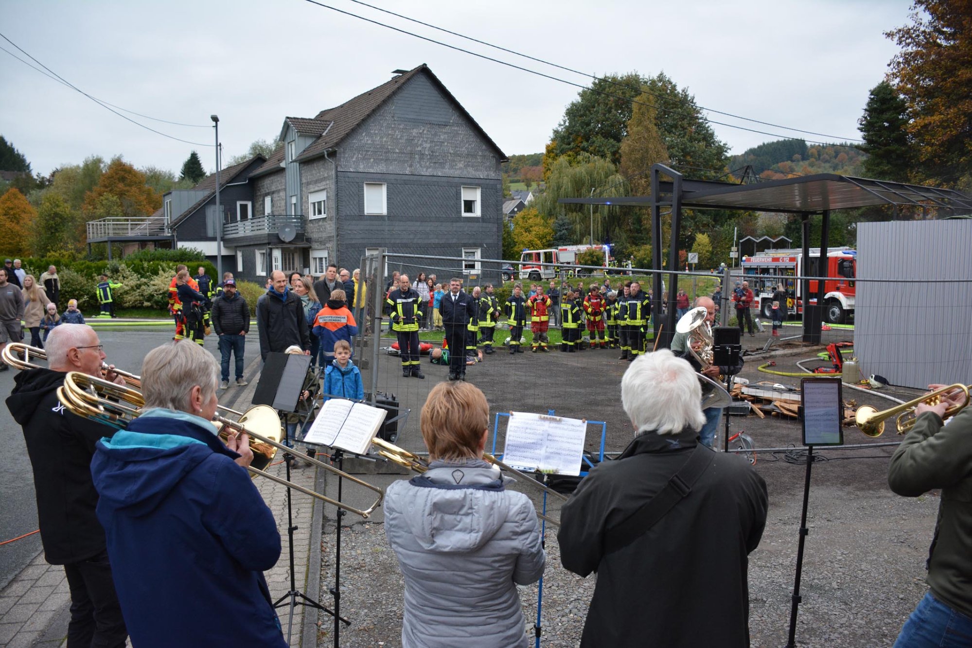 Moderiert wurde die komplette Herbstübung von Feuerwehr-Pressesprecher Dietmar Kalteich. Zum Abschluss des öffentlichen Teils der Übung begleitete ebenfalls traditionell der CVJM-Posaunenchor Büschergrund mit zwei Vortragsstücken die Feuerwehr.