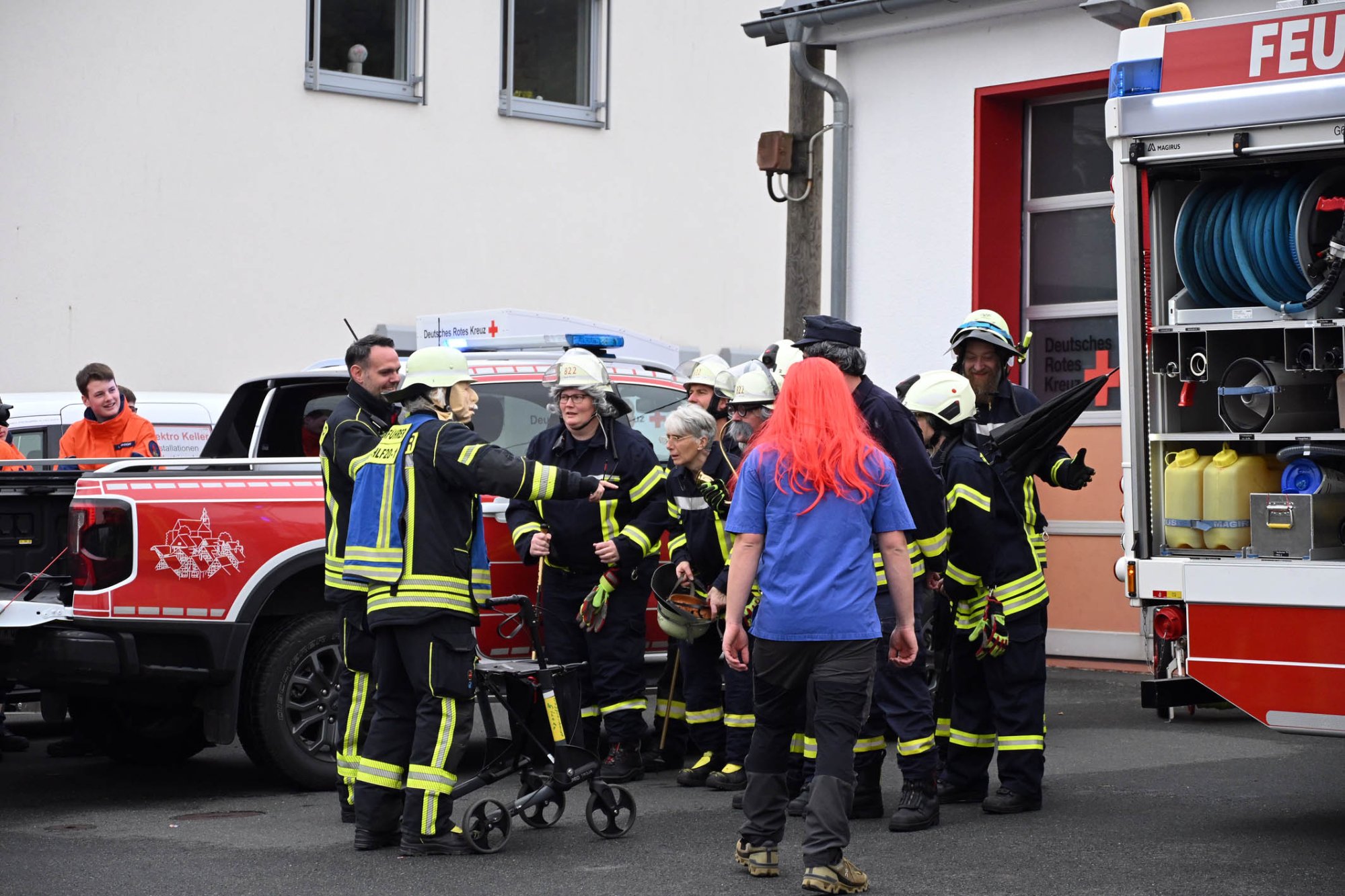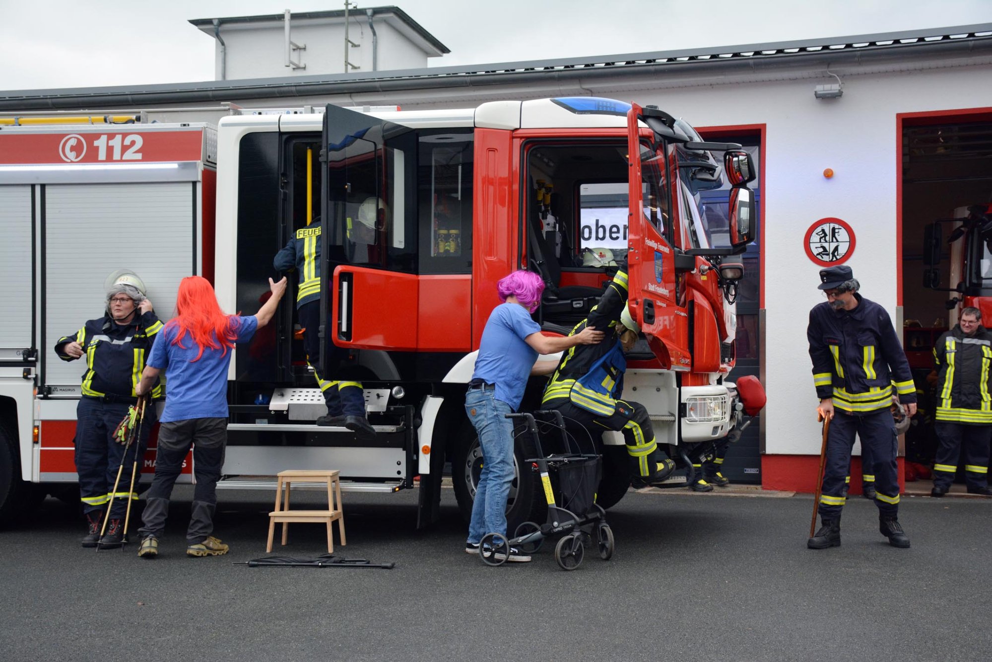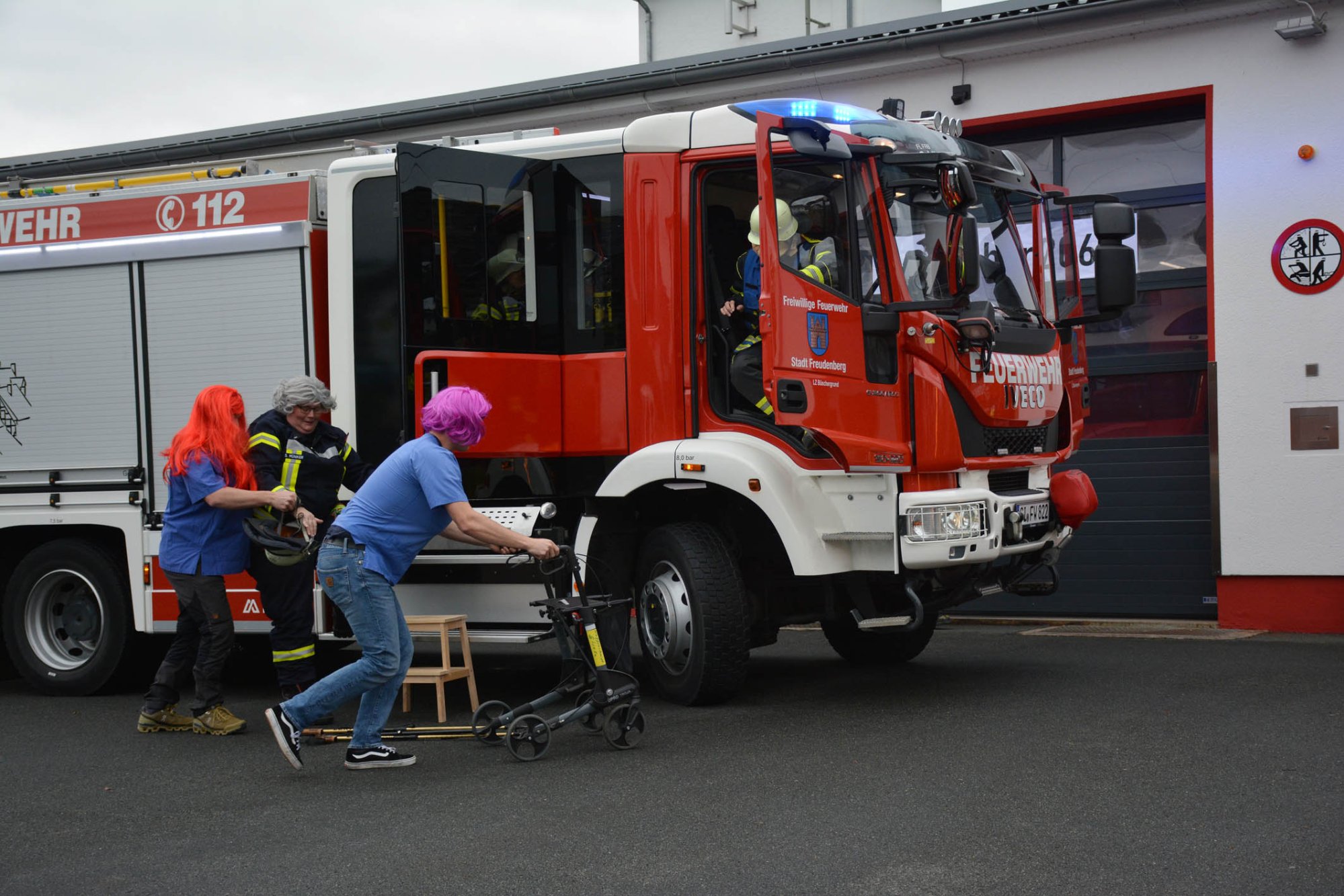 Mit Rollator, Gehstöcken und Krücken rückten die „Einsatzkräfte“ zum Brand vor. Als das äußert lustige Szenario plötzlich "eingefroren" wurde und sich die Türen des hochmodernen Löschfahrzeugs erneut öffneten, übernahmen die Mädchen und Jungen der Kinderfeuerwehr blitzschnell den Einsatz und hatten in kürzester Zeit den Brand gelöscht.