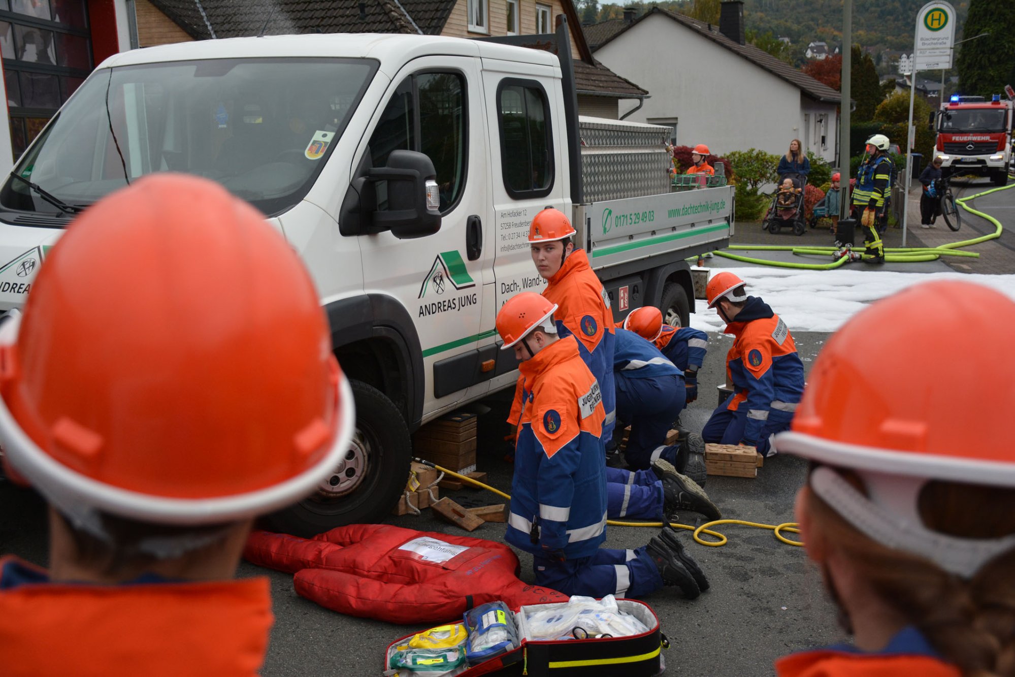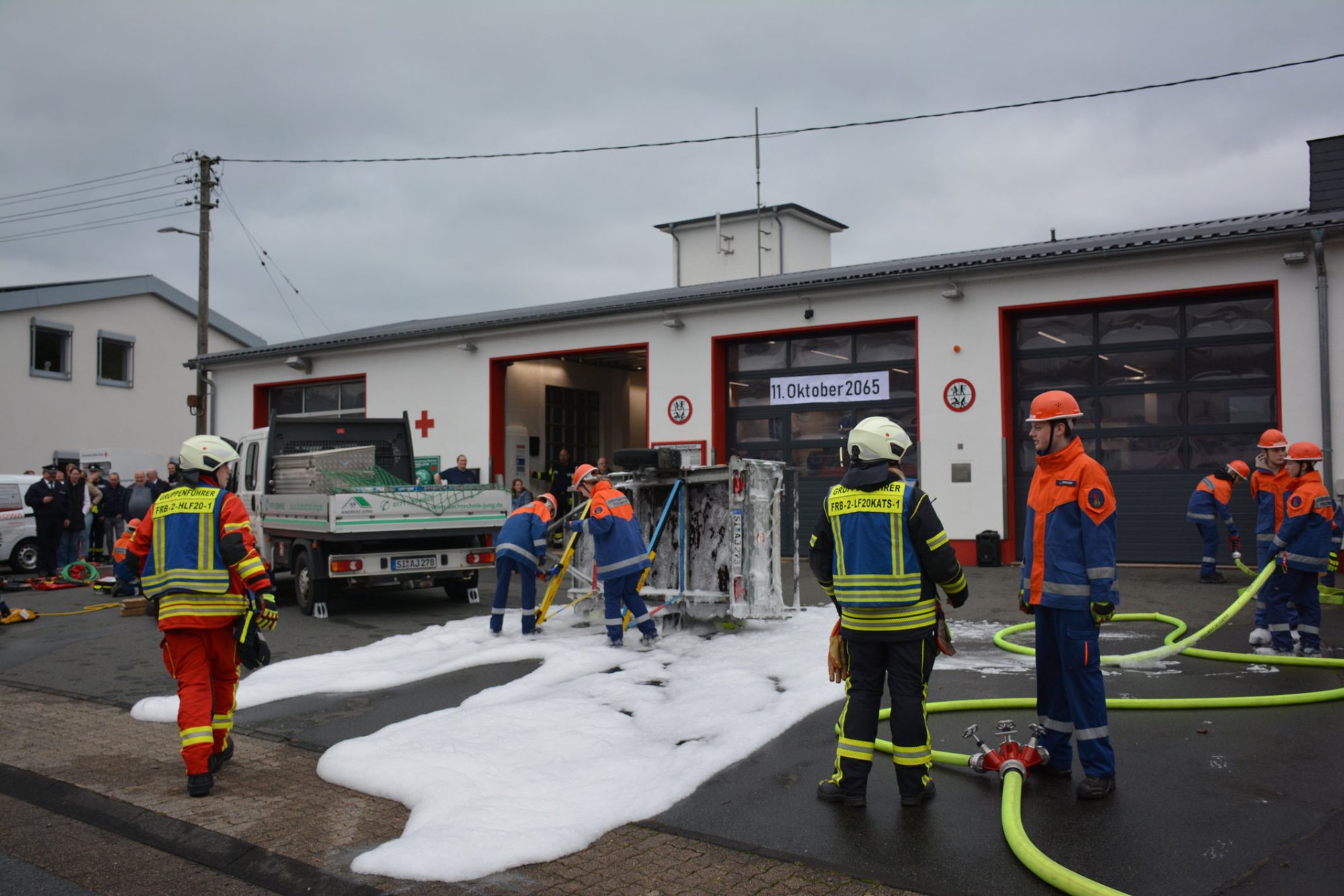 Im nächsten Programmpunkt zeigte die Jugendfeuerwehr, wie professionell sie gestellte Aufgaben erledigt. In einer nachgestellten Szenerie galt es, eine eingeklemmte Person unter einem Transporter zu befreien. Gleichzeitig mussten sie den umgestürzten, in Brand geratenden Anhänger sichern und das Feuer löschen. Unter Zuhilfenahme von Hebekissen wurde das Fahrzeug angehoben und die Person aus ihrer misslichen Lage befreit. Eine zweite Gruppe bekämpfte den Brand mit einem Schaumrohr und sicherte den Anhänger gegen weiteres Umstürzen.