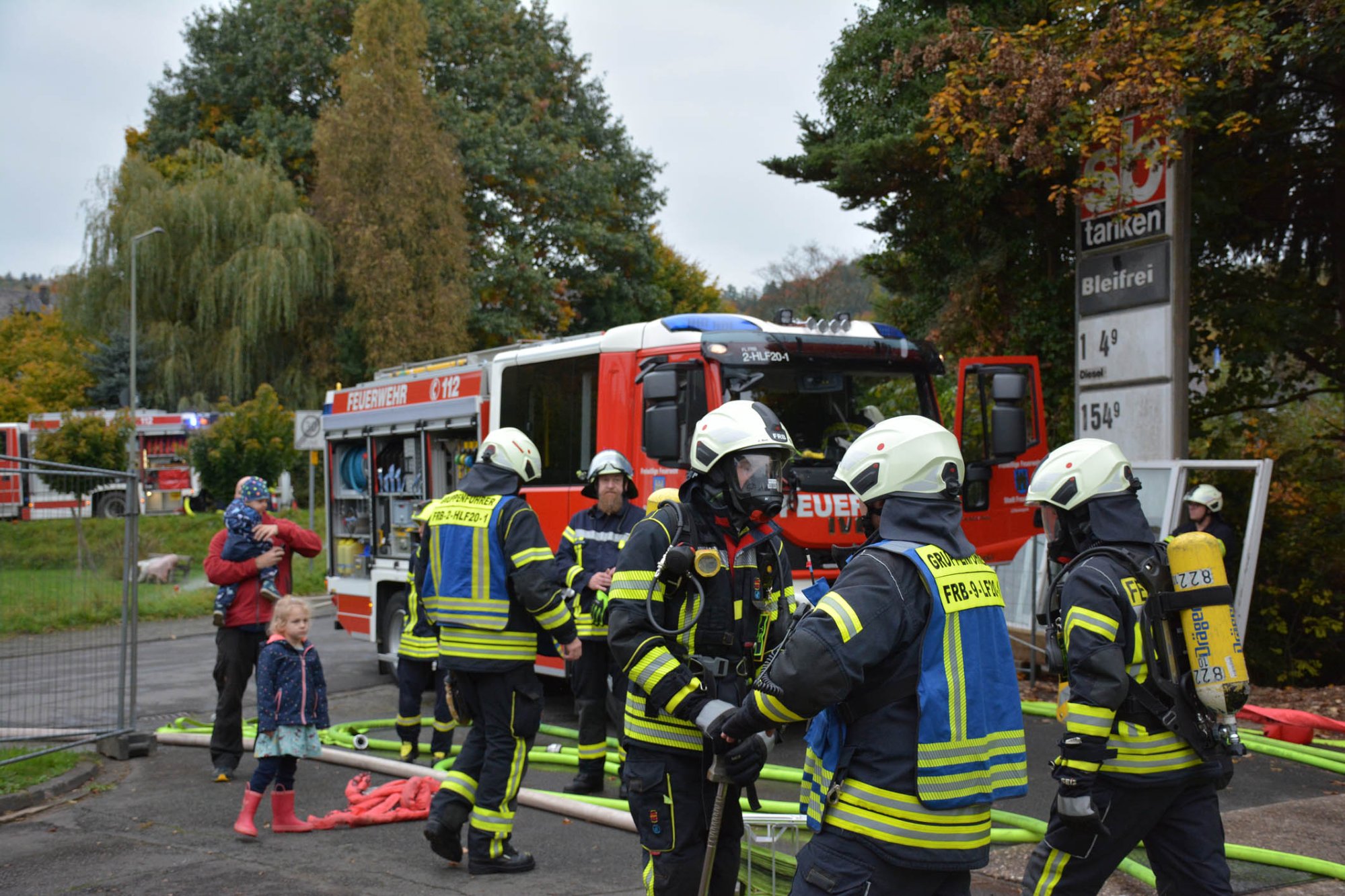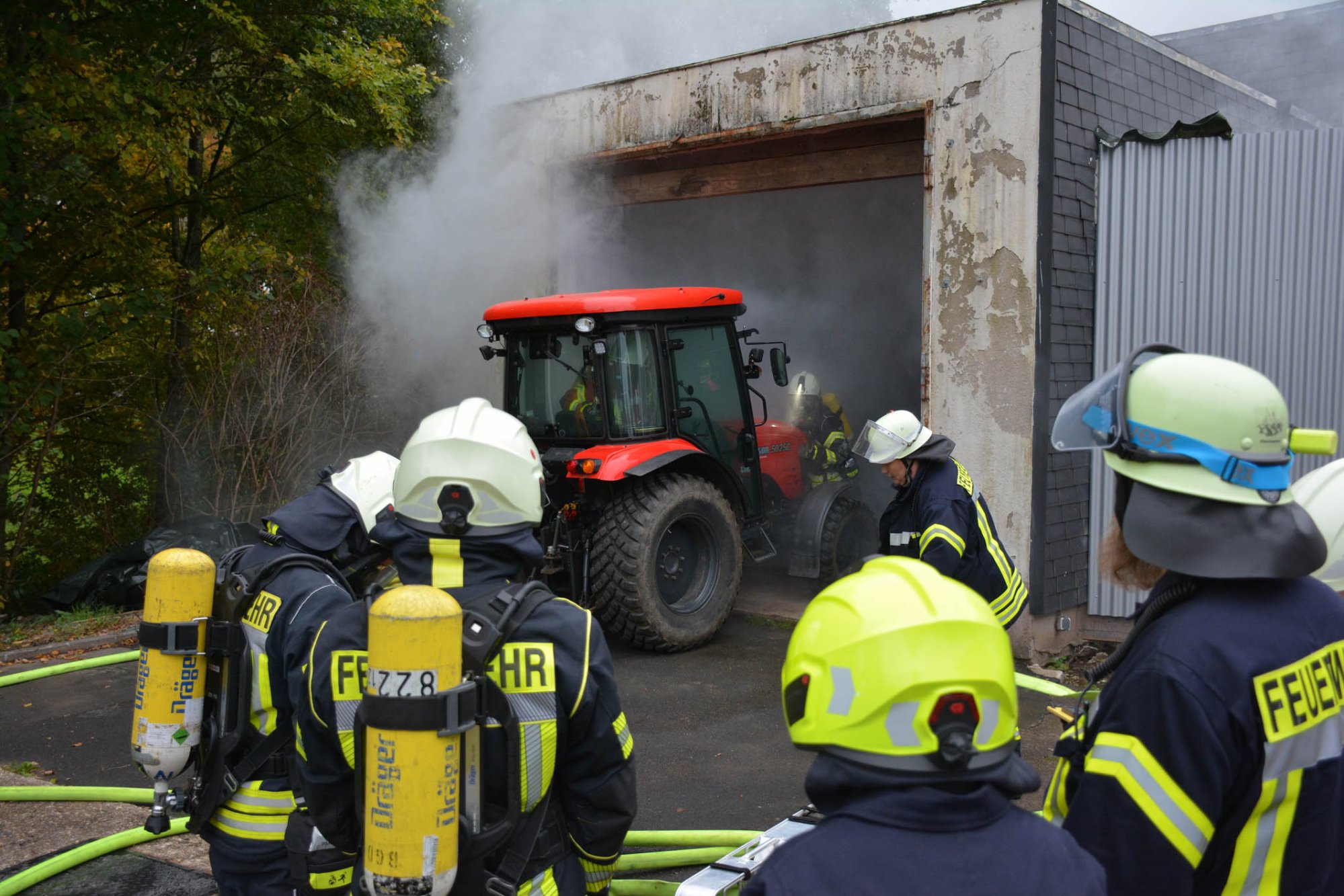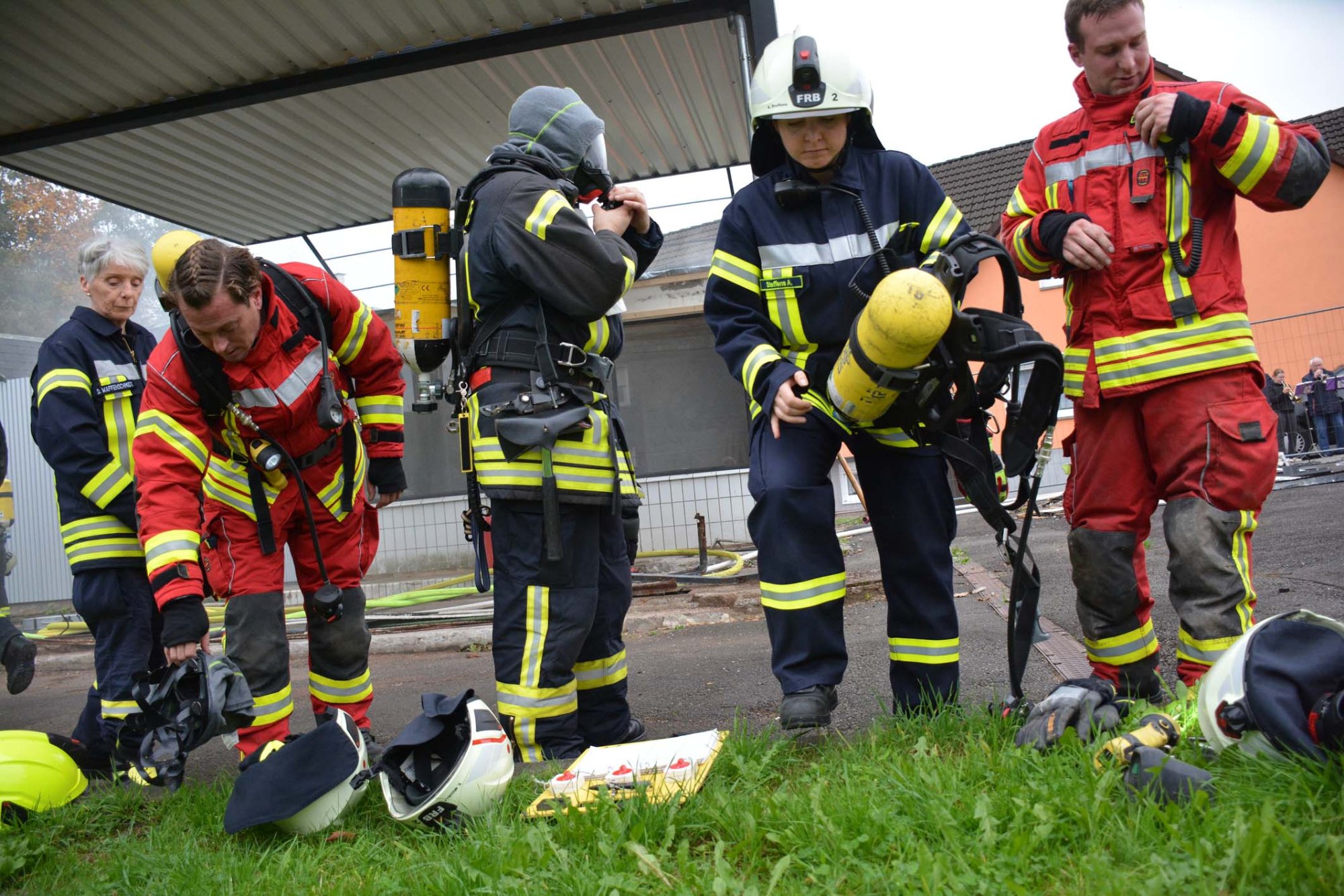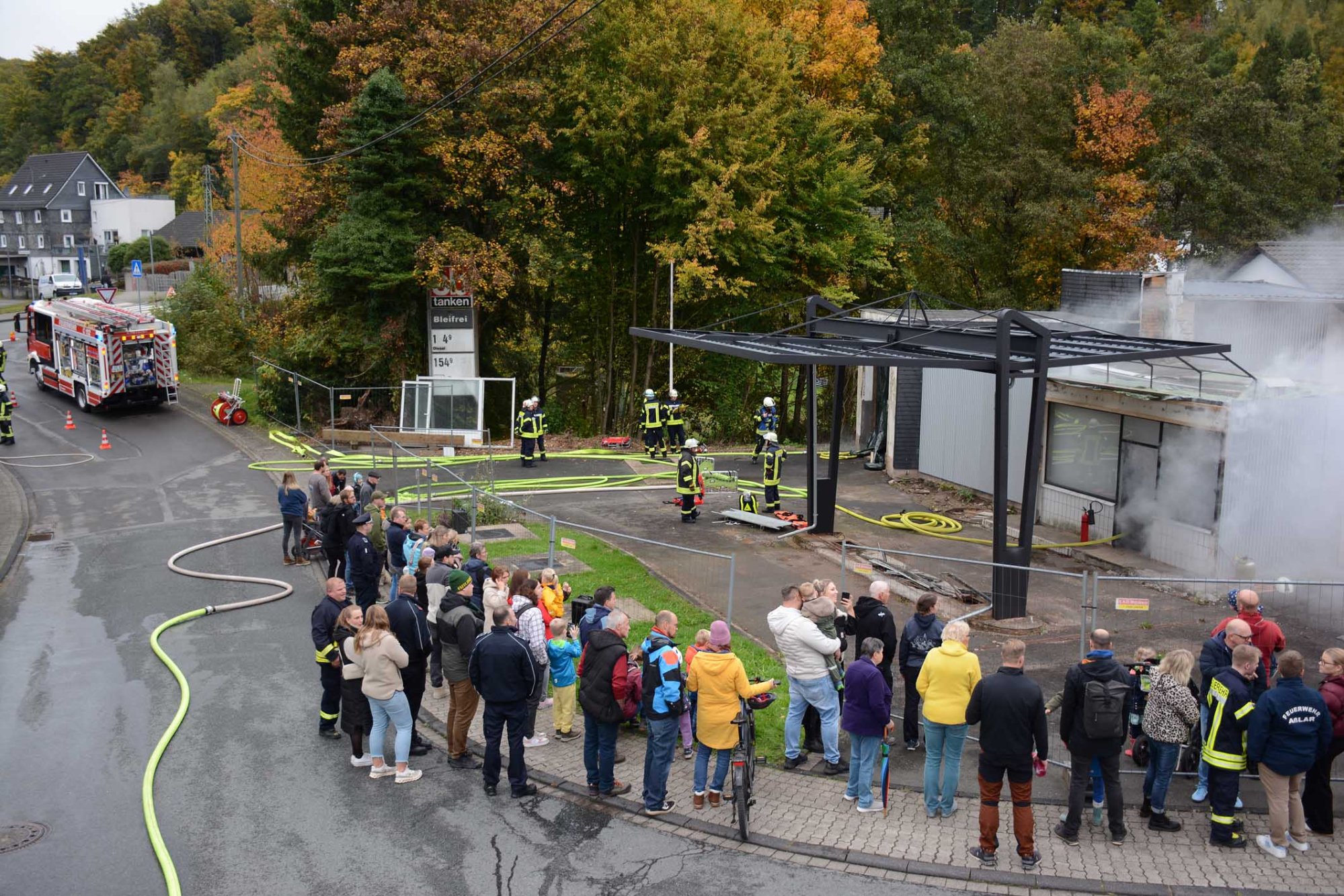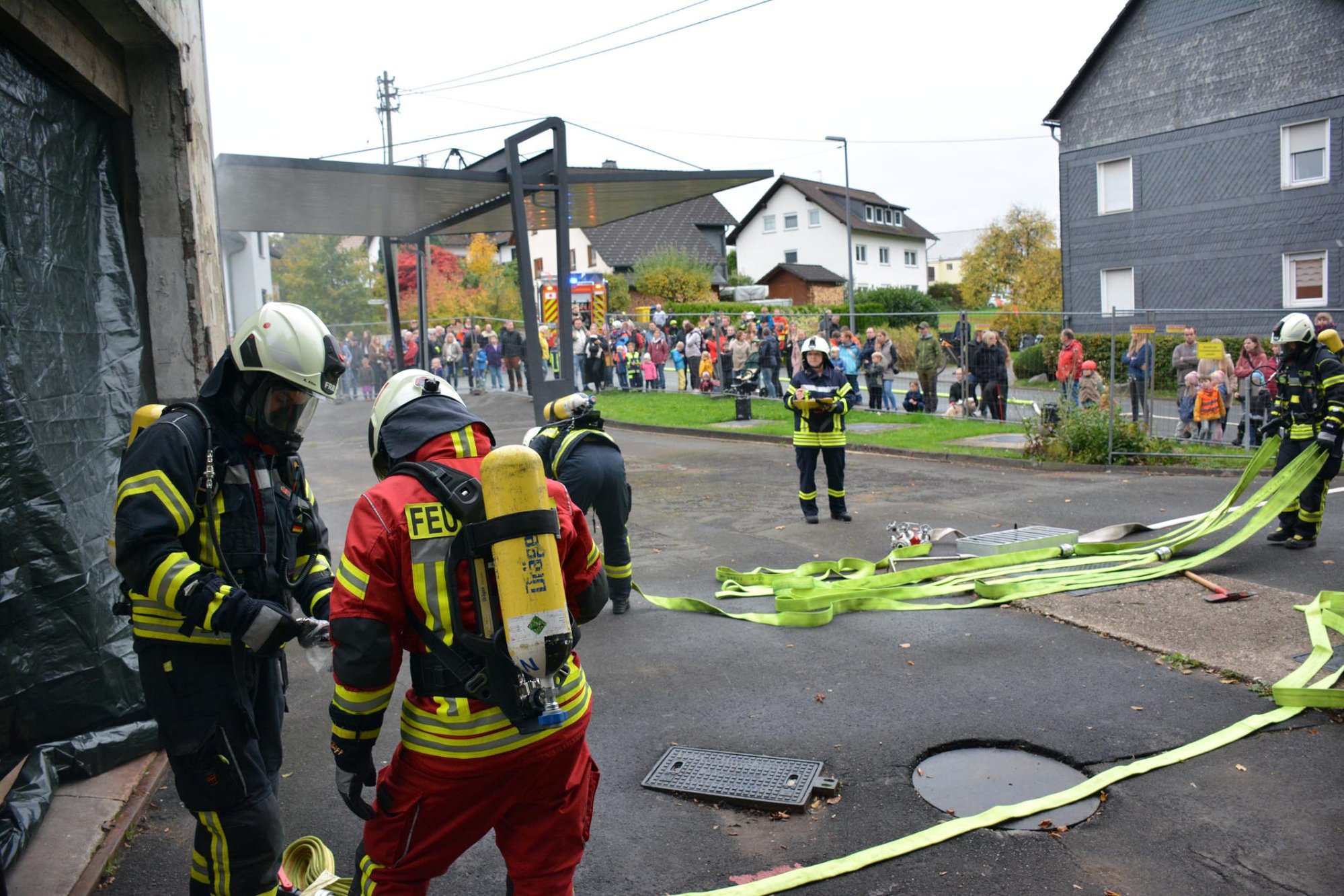 Für die Alarmübung begaben sich die Zuschauer, nach einem kurzen Fußmarsch, an das Ende der Bruchstraße. In einer ehemaligen Tankstelle demonstrierte die aktive Wehr, wie unter Atemschutz zwei vermisste Personen aus dem „brennenden“ und völlig verqualmten Gebäude gesucht und anschließend ins Freie gebracht wurden. Ein in einer Garage befindlicher Traktor wurde unter Zuhilfenahme einer Seilwinde aus dem Gefahrenbereich gezogen. Das vermeintliche Feuer wurde schnell unter Kontrolle gebracht bzw. gelöscht.