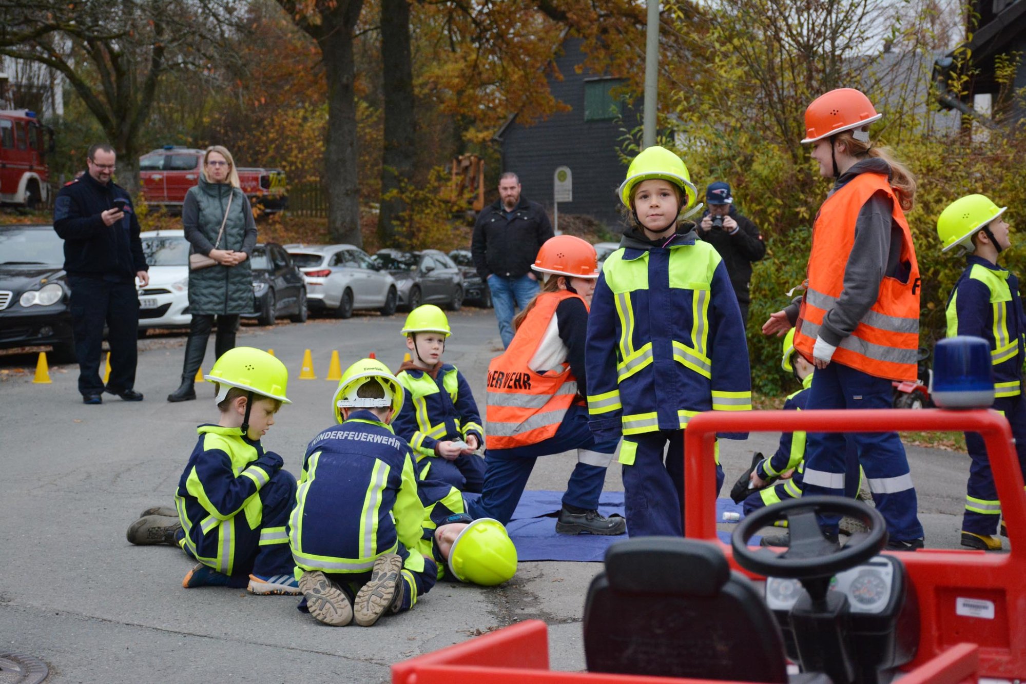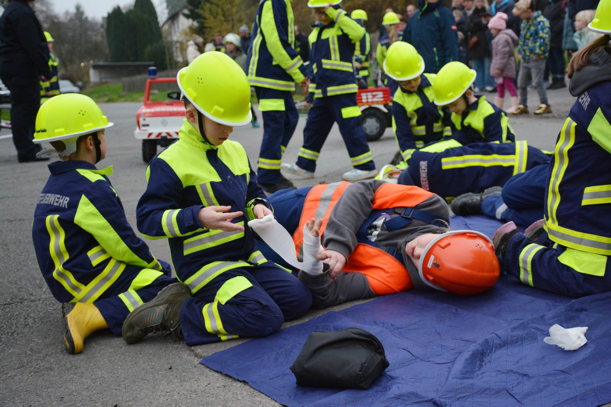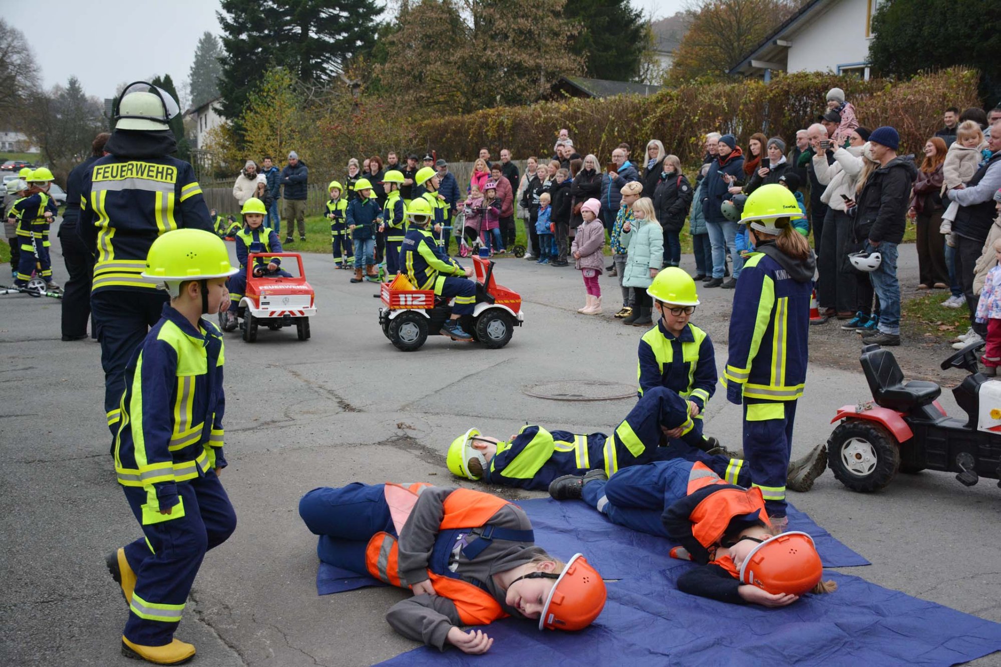 Nächster Programmpunkt war eine Übung der Kinderfeuerwehr. Bei einem nachgestellten Unfall hatte der Fahrer eines Kindertraktors zwei Bauarbeiter angefahren, die dabei verletzt wurden. Auch der Fahrer des Traktors verletzte sich hierbei. Ein Notruf wurde abgesetzt und die "Feuergeister" rückten zum Einsatzort aus.
