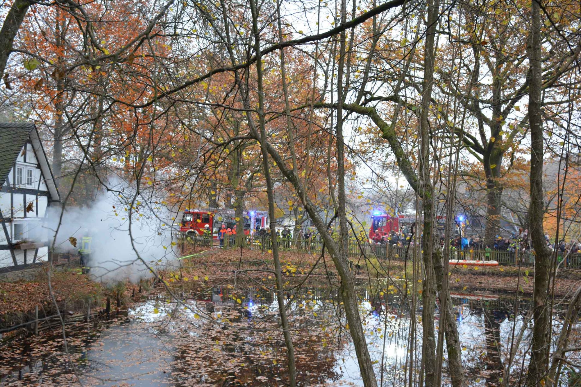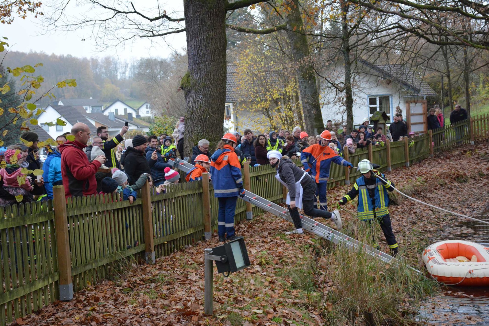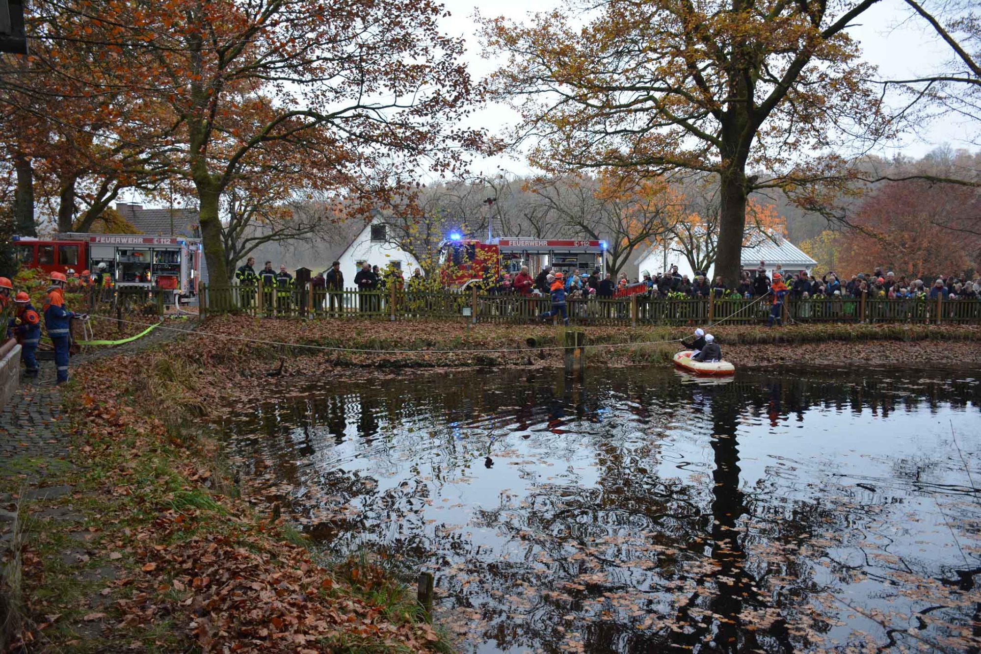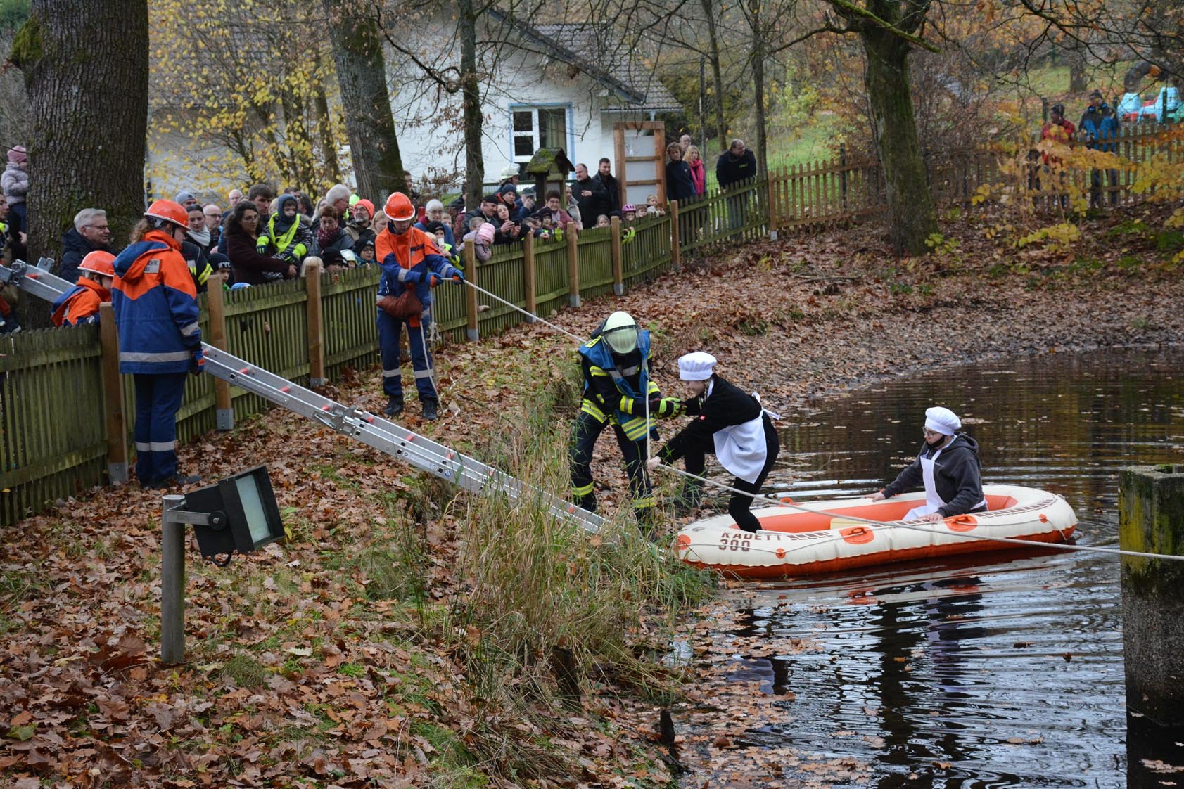 Die Übung der Jugendfeuerwehr fand am alten Backes neben dem Pfarrweiher statt. Hier kam es zu einer angedeuteten Mehlstaubexplosion, bei der das Gebäude Feuer fing. Personen, die sich im Backes befanden, konnten sich ins Freie retten und mit einem Schlauchboot in Sicherheit bringen. Dort wurden sie von der Feuerwehr in Empfang genommen, gleichzeitig wurde der Brand gelöscht.