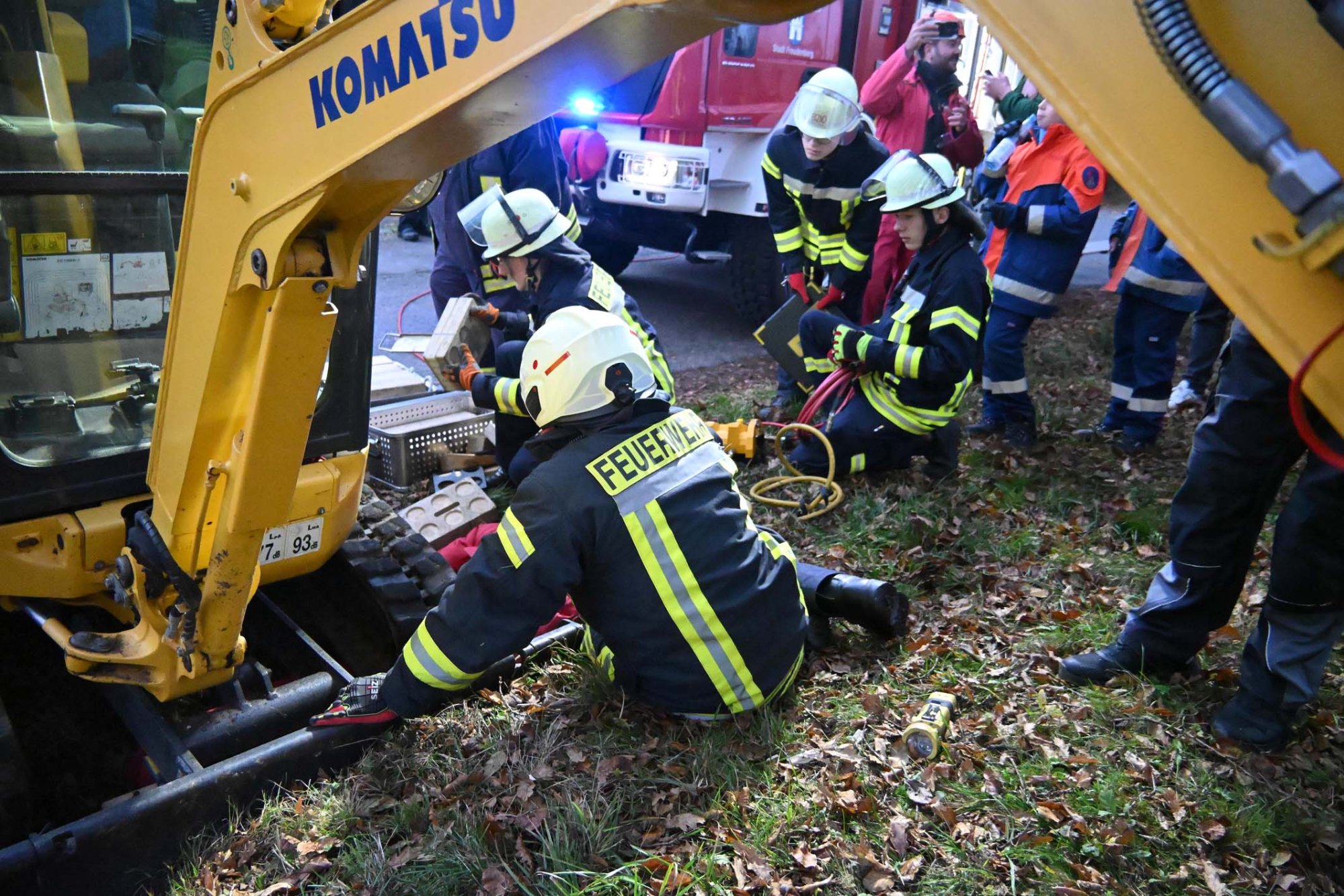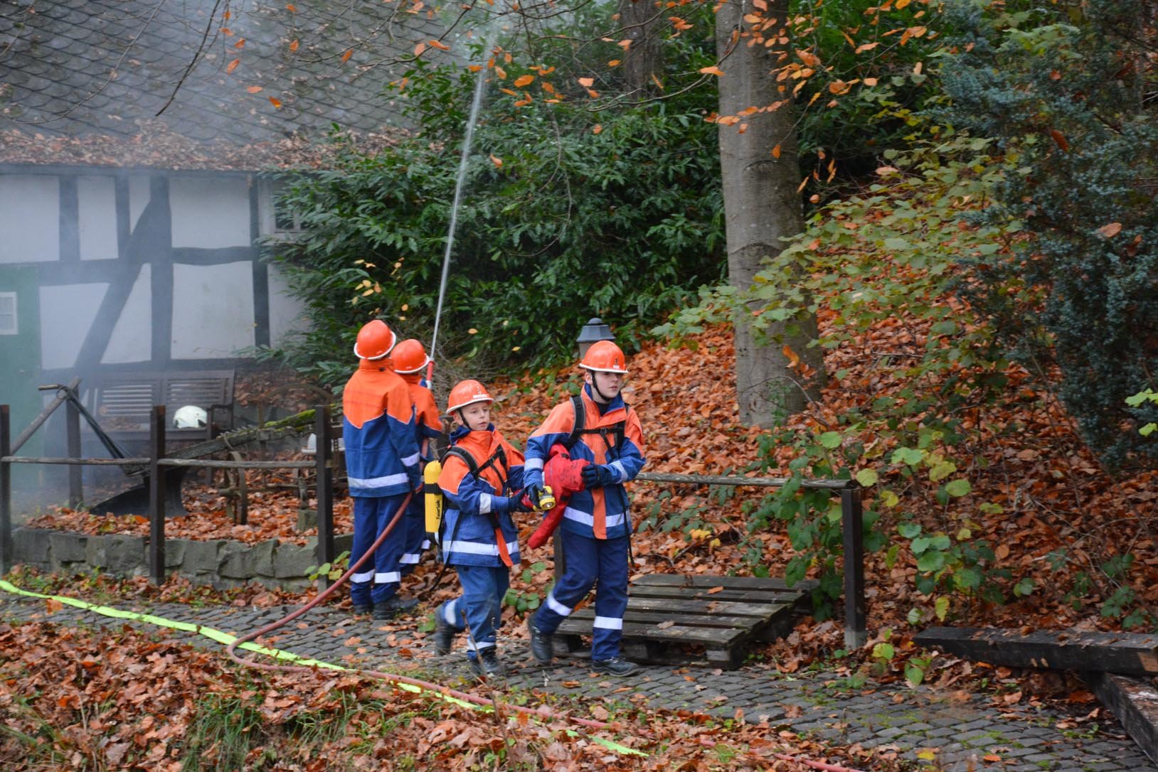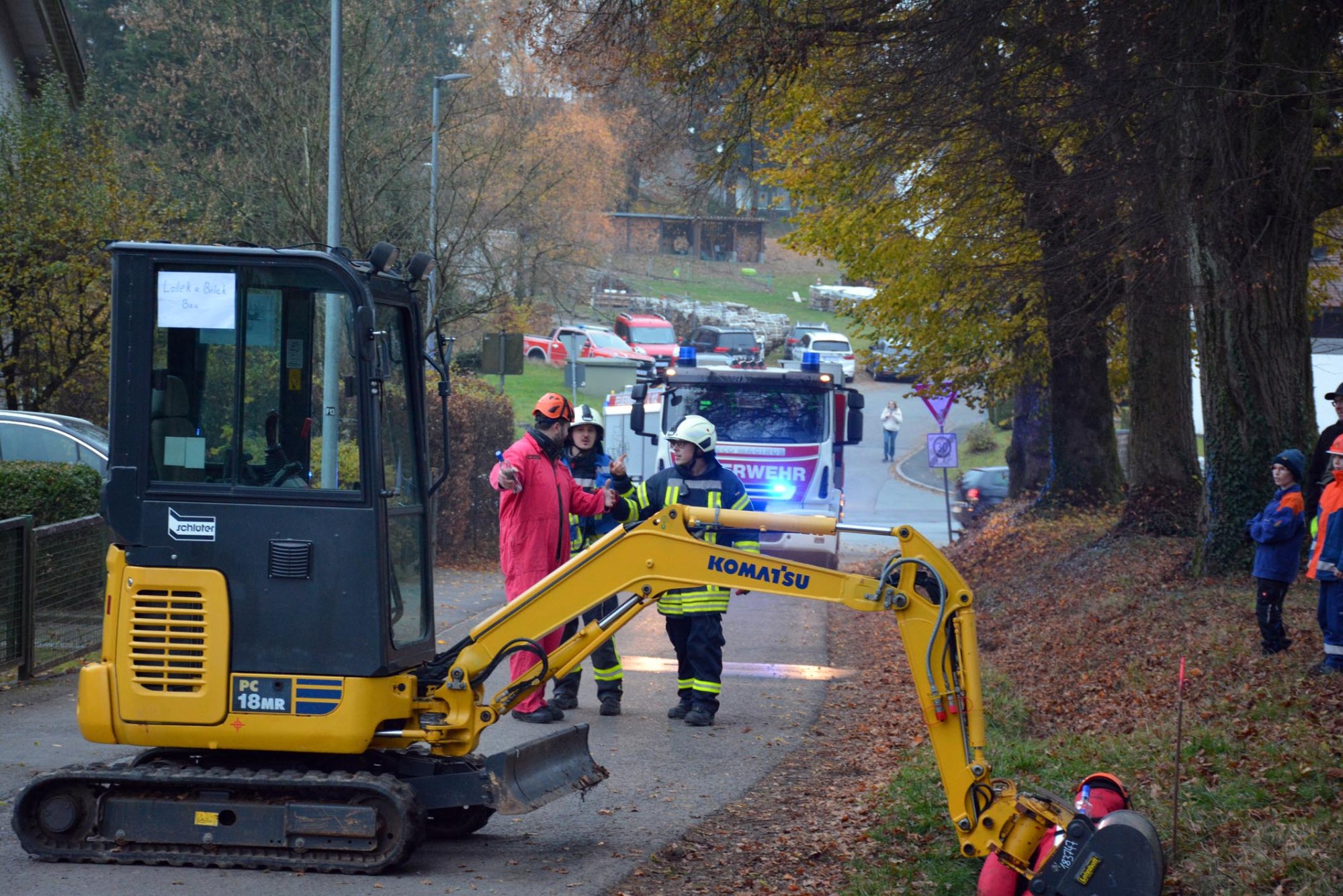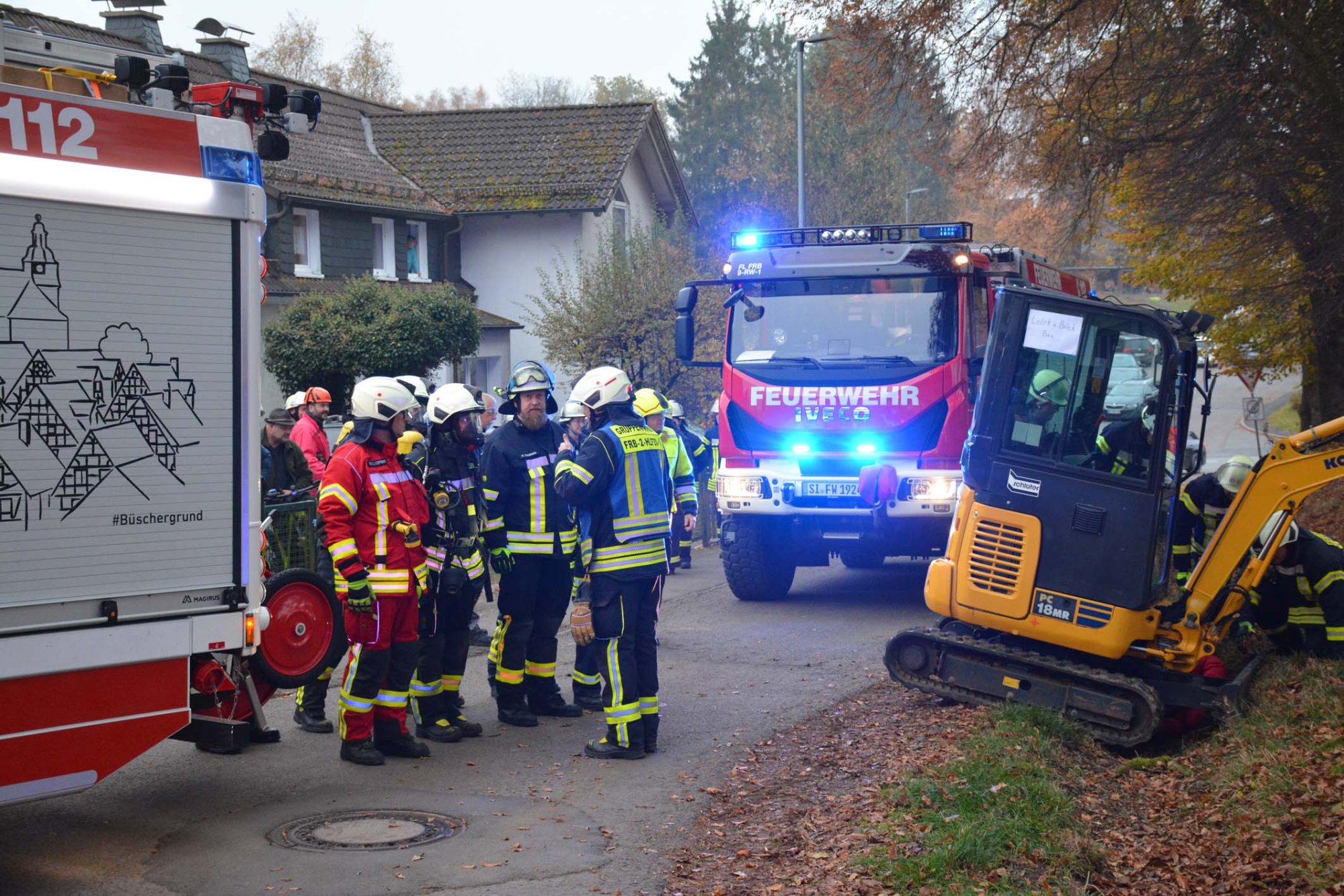 Die diesjährige Übung der Einsatzabteilung fand „Auf der Linde“ statt. Folgendes Szenario hatten sich die Verantwortlichen als ausgedacht: Auf dem traditionellen „Oberholzklauer Oktoberfest“ kommt es in einem Gebäude zu einer Verpuffung. Ein Feuer bricht aus setzt Teile des Gebäudes in Brand. Drei Personen werden dabei im Gebäude vermisst und müssen gerettet werden. Abgelenkt durch das Feuer im benachbarten Gebäude überfährt ein Baggerfahrer einen Kollegen, der unter dem Bagger eingeklemmt wird.