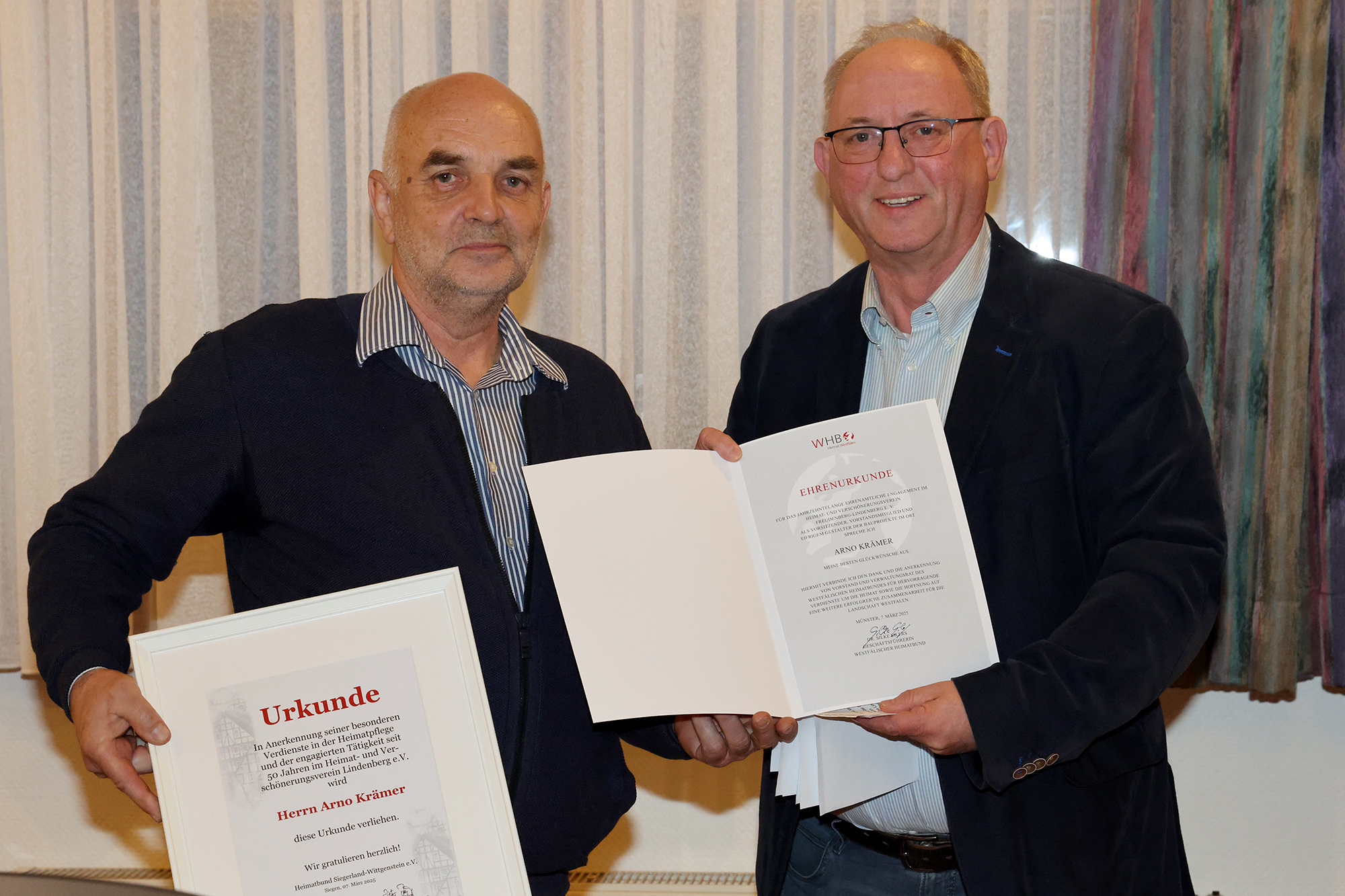 Nach den Wahlen richteten die neuen Vorstandsmitglieder den Blick auf das Jahr 2025 und besprachen anstehende Projekte und Aktivitäten. Zum Abschluss ehrten Heimatgebietsleiter Dieter Dröps und Bernd Brandemann als Vorstand der ARGE der Heimatvereine Arno Krämer für seine langjährige, engagierte und positive Mitarbeit im Vorstand. Als besondere Anerkennung für seine Verdienste wurde Arno zum Ehrenvorstandsmitglied gewählt.