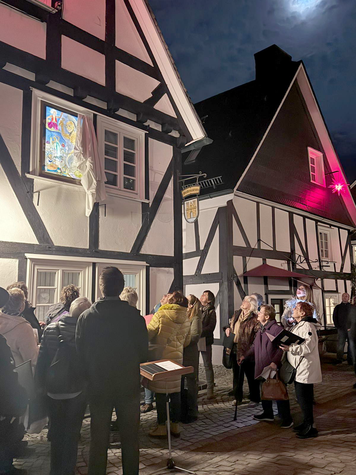 Höhepunkt des Abends war die Enthüllung des ersten Fensters, das hinter einem Tuch verborgen war. Es sorgte nicht nur für Beifall, sondern machte auch gleich Lust auf die weiteren Motive, die in den kommenden Tagen zu entdecken sind.
