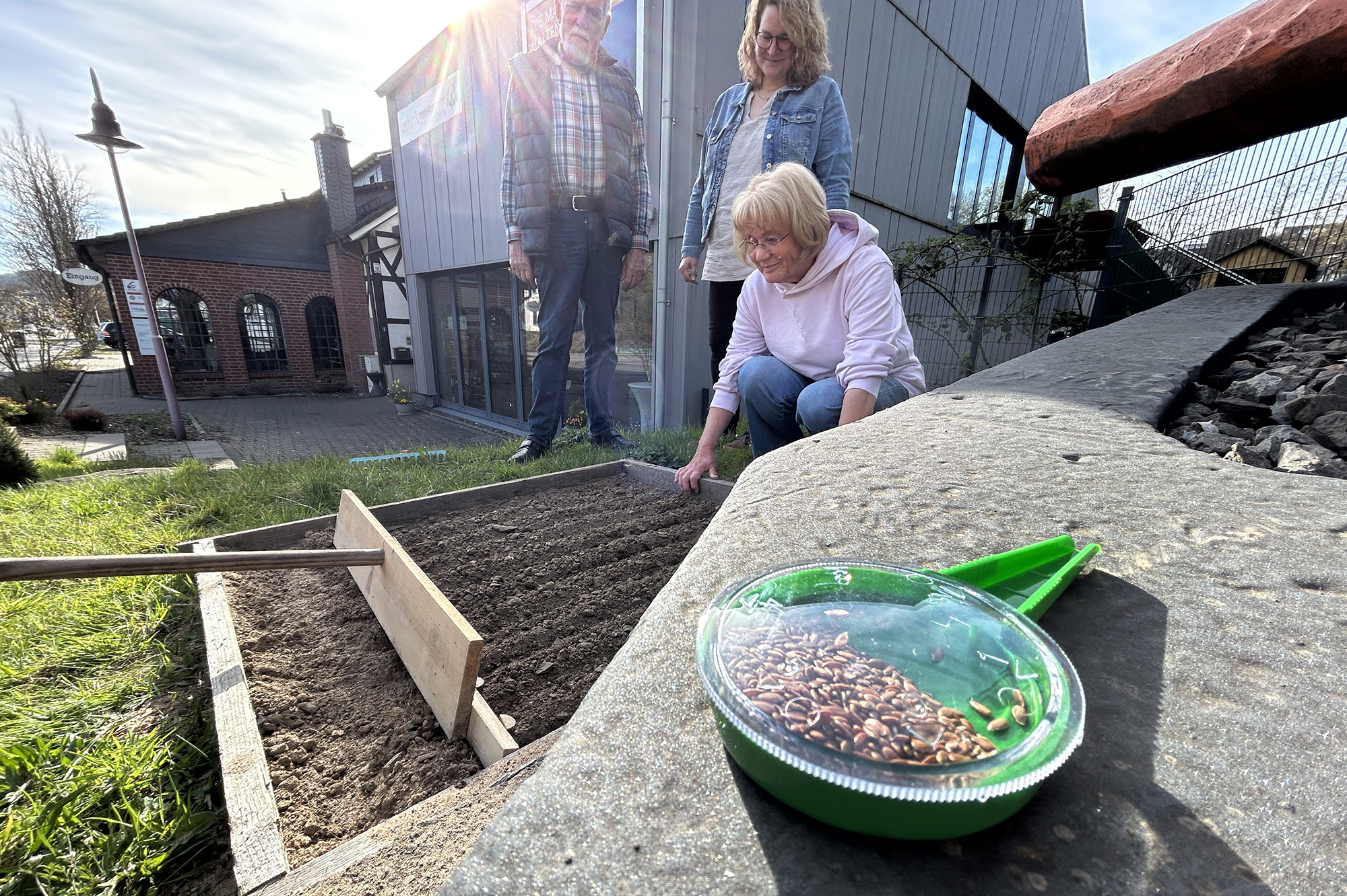 Christine und Rüdiger Tolsdorf haben das 1 Quadratmeter große Beet direkt an der Olper Straße angelegt und vorbereitet. Mit Ernst-Otto Ohrndorf vom Arbeitskreis Dorferneuerung und Dorfgeschichte Langenholdinghausen steht ein Flachs-Kenner beratend und mit jeder Menge Gerätschaften zur Seite. Für die spätere Weiterverarbeitung zum fertigen Produkt sind Inge Zöller und Birgit Bohn zuständig.