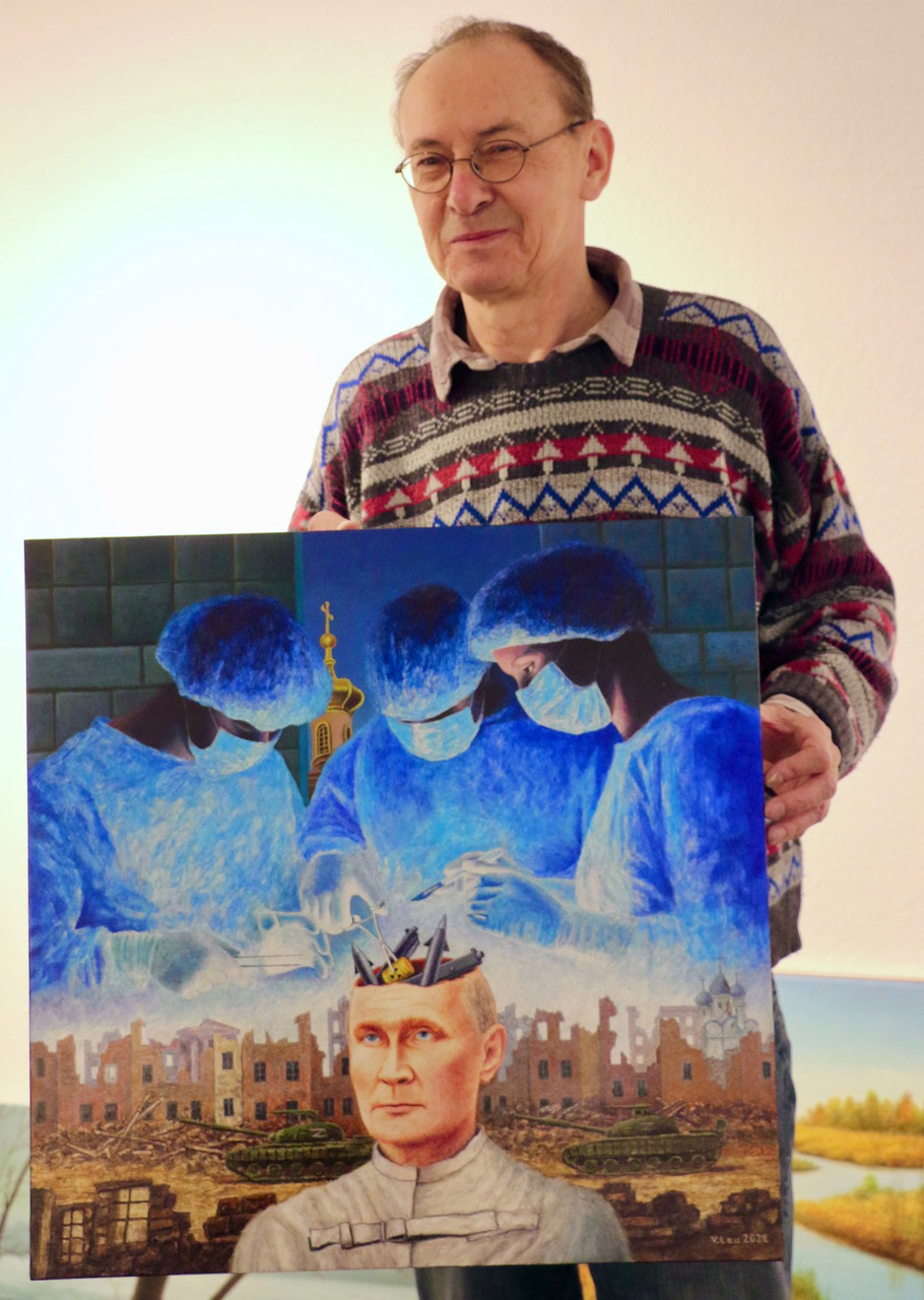 In seinen Ölgemälden setzt er sich gekonnt mit aktuellen Themen auseinander. „Mit Putins Angriffskrieg sind alle Illusionen auf ‚ewigen Frieden' geplatzt", erklärt Victor Lau einige seiner politischen Werke. „Spezialoperation" betitelt er ein Bild mit Putin, ein anderes, angelehnt an den James-Bond Film-Titel, „From Russia with Love". Nur vermeintlich steht darin die Friedenstaube im Mittelpunkt, die Patronen am Boden zeigen die wahre Natur. Der 60-jährige Lau ist in Kasachstan geboren, lebte einige Jahre in Kirgistan und in Moldau, was seine Sensibilität für diese Thematik erklärt.