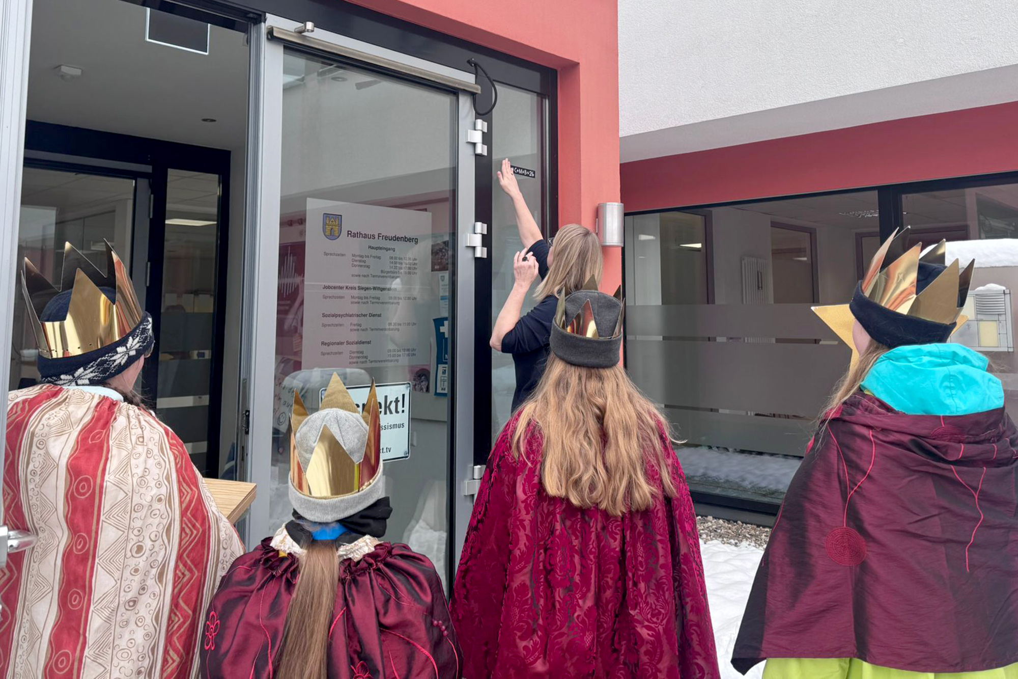 Freudenberg. Zum Start des neuen Jahres sind auch die Sternsinger wieder in Freudenberg unterwegs. Trotz der winterlichen Wetterbedingungen lassen sie sich nicht davon abhalten, von Tür zu Tür zu gehen, um ihre Segenswünsche zu überbringen. Am Montag besuchten Katharina Hesse, Emma Fitzke, Malia Rudolph und Alexa Münker das Rathaus, um Bürgermeisterin Nicole Reschke ihre Segenswünsche zu übermitteln. Mit Unterstützung der Verwaltungs-Chefin brachten sie dort auch die traditionellen Segensaufkleber an.
