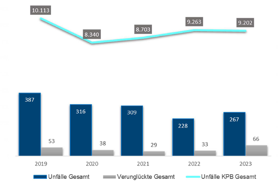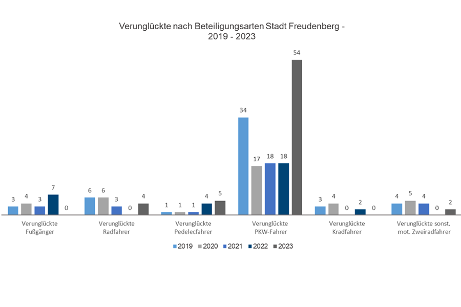 Blickt man auf die so genannten Beteiligungsarten, waren es mit 54 vor allem die Pkw-Fahrer, die es im vorigen Jahr "erwischte". In den drei Jahren davor lag die Zahl bei 17 bzw. 18. Auch die Zahl der verunglückten Fußgänger sieg von drei im Jahr 2022 auf sieben in 2023 an. Positiv: Es gab im Jahr 2023 keinen einzigen verunglückten Kradfahrer. Sehr wohl allerdings Radfahrer (4, 2022: 0) und Pedelecfahrer (5, 2022: 4), die im Straßenverkehr verunglückten.