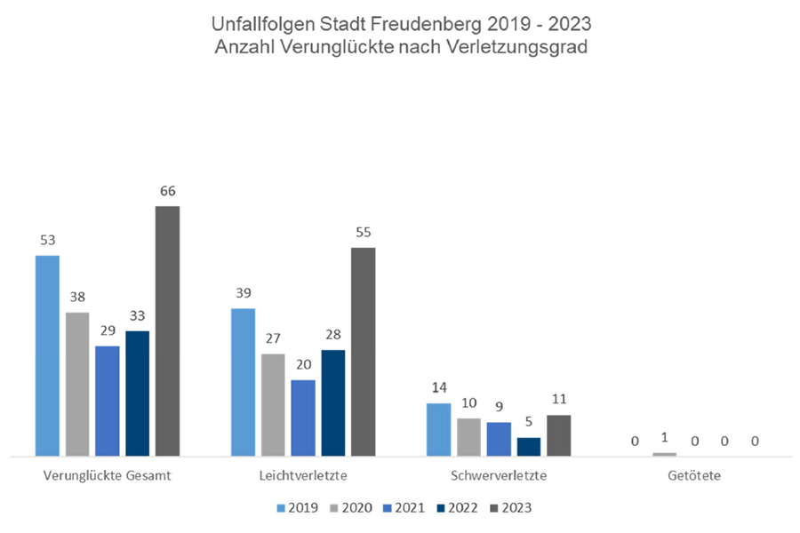 Insgesamt 267 Unfälle verzeichnete die Polizei im vorigen Jahr; 2022 waren es "nur" 228. Dabei stieg die Zahl der Verletzten von 33 im Jahr 2022 auf 66 in 2023. Die Zahl der Leichtverletzten stieg dabei von 28 auf 55; die der Schwerverletzten von fünf auf elf. Die gute Nachricht immerhin: Im dritten Jahr in Folge wurde kein Verkehrsteilnehmer im Freudenberger Stadtgebiet getötet.