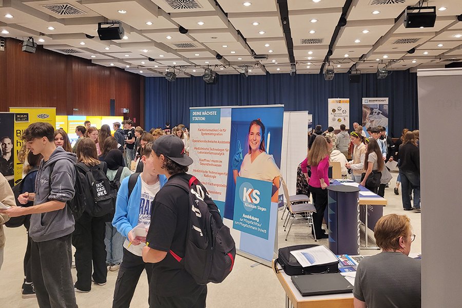 Nachdem die Jugendlichen am Vormittag viele Kontakte zu den Firmen und Institutionen knüpfen konnten, gab es nach der Mittagspause Zeit für persönliche Gespräche mit den Akteuren, für die Suche nach einem Praktikumsplatz oder einer Ausbildung, für Fachvorträge zu dualen Studiengängen, dem Lehramtsstudium an der Uni Siegen sowie Speed-Datings in verschiedenen Klassenräumen der Schule.