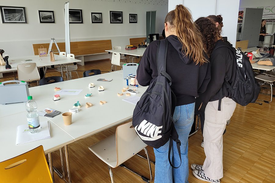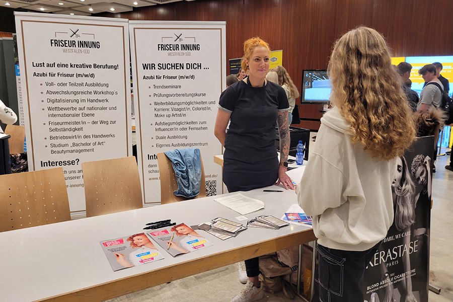 Dass ein Handwerk viele Facetten hat, konnten die Schülerinnen und Schüler selbst erleben, denn viele Aussteller hatten kleine Mitmachaktionen und praktische Übungen im Gepäck, die sie frühestens in einem Praktikum oder bei der Ausbildung erlernen würden. Professionell angeleitet bauten sie unter anderem Dachstühle, polierten Gebisse, wickelten Wraps, maßen Blutdruck, flochten Zöpfe und informierten sich mittels VR-Brillen über weitere Berufsfelder. Bei Bedarf gab es bei der Friseur-Innung Westfalen-Süd sogar einen neuen Haarschnitt.