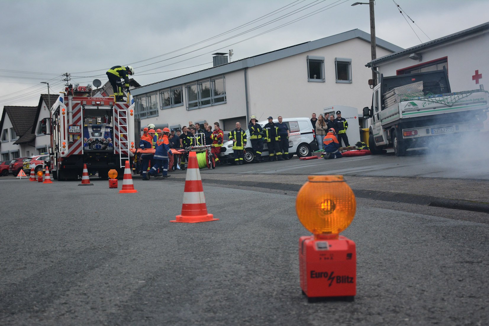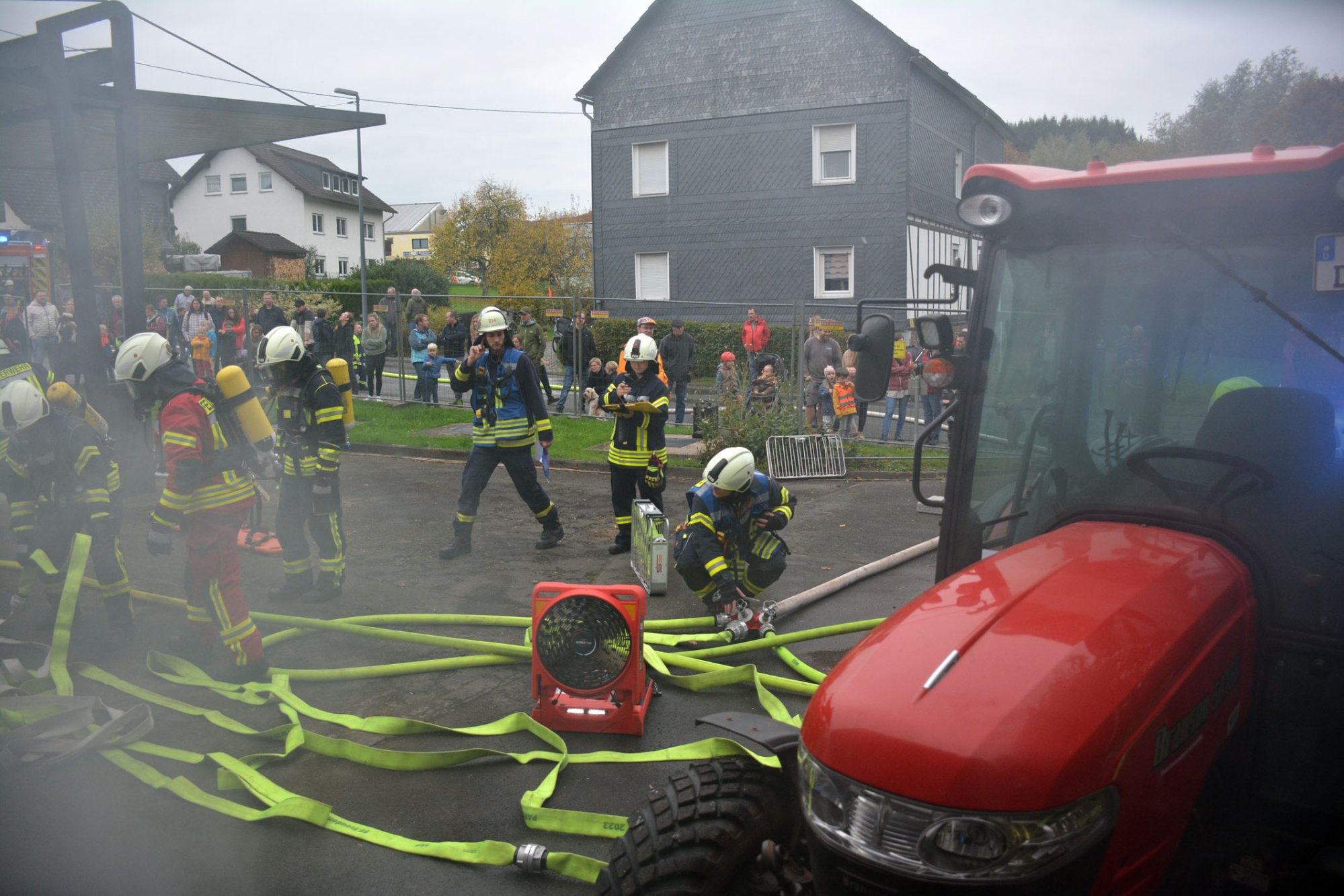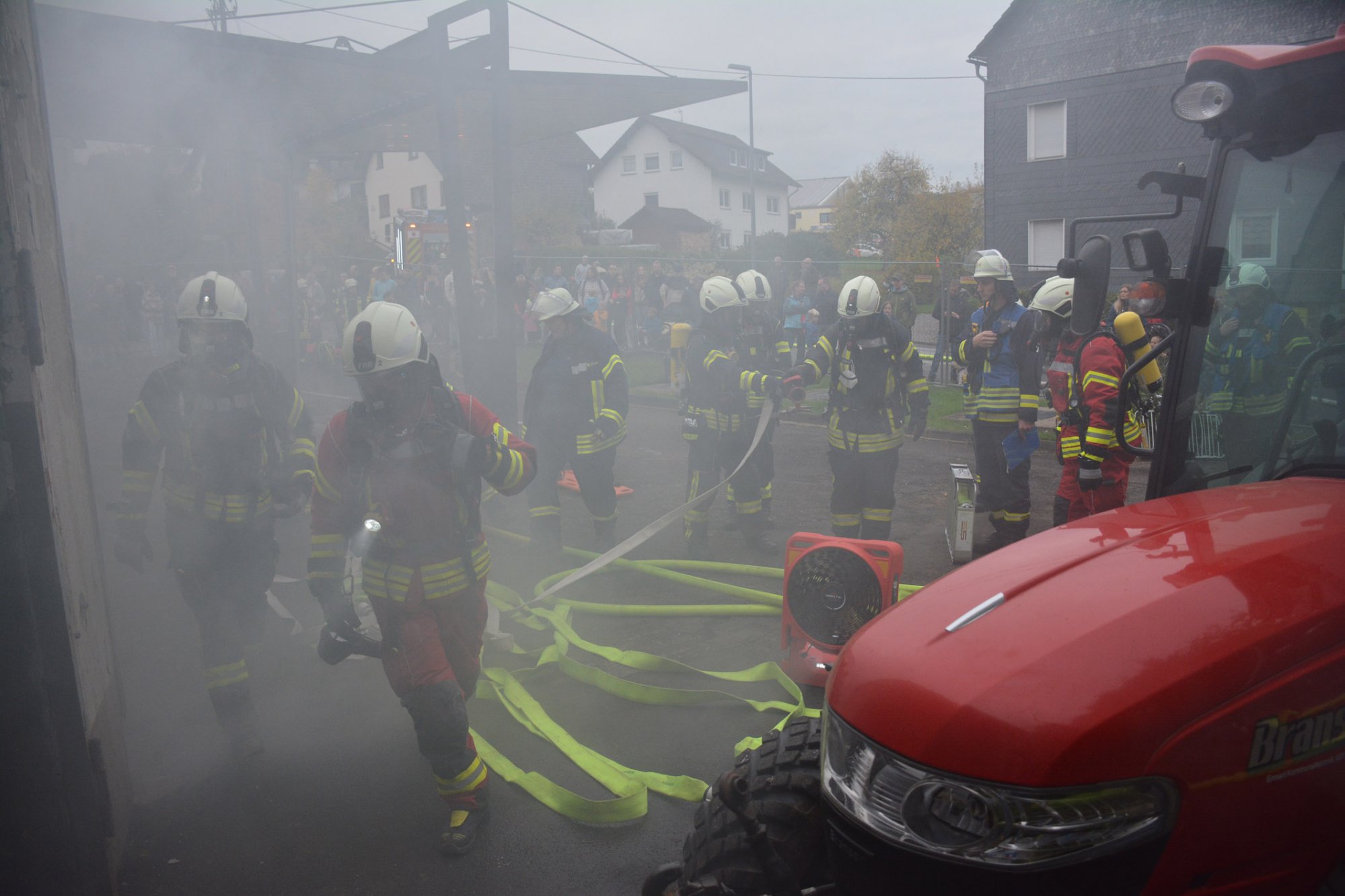 Für die Alarmübung begaben sich die Zuschauer, nach einem kurzen Fußmarsch, an das Ende der Bruchstraße. In einer ehemaligen Tankstelle demonstrierte die aktive Wehr, wie unter Atemschutz zwei vermisste Personen aus dem „brennenden“ und völlig verqualmten Gebäude gesucht und anschließend ins Freie gebracht wurden. Ein in einer Garage befindlicher Traktor wurde unter Zuhilfenahme einer Seilwinde aus dem Gefahrenbereich gezogen. Das vermeintliche Feuer wurde schnell unter Kontrolle gebracht bzw. gelöscht.