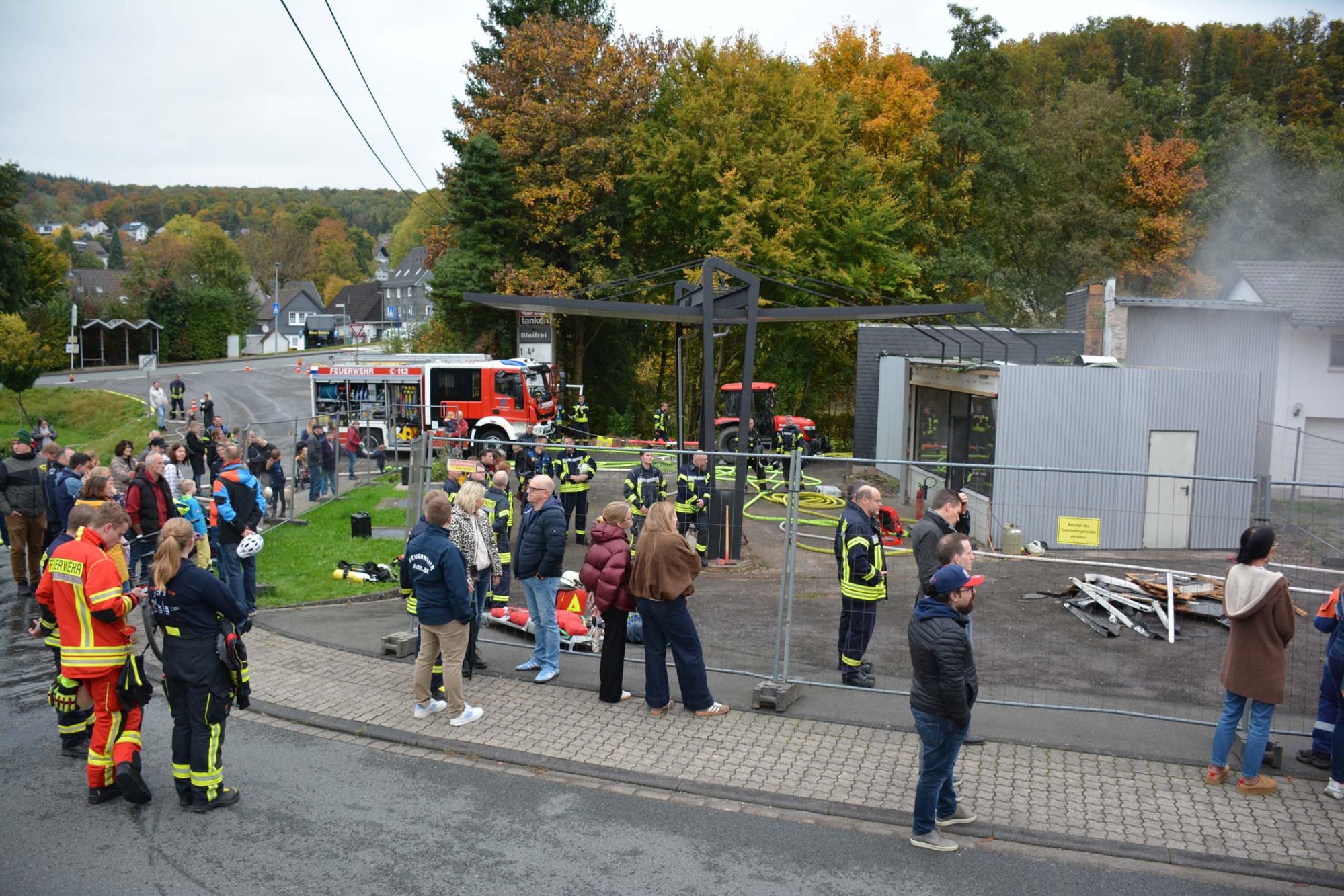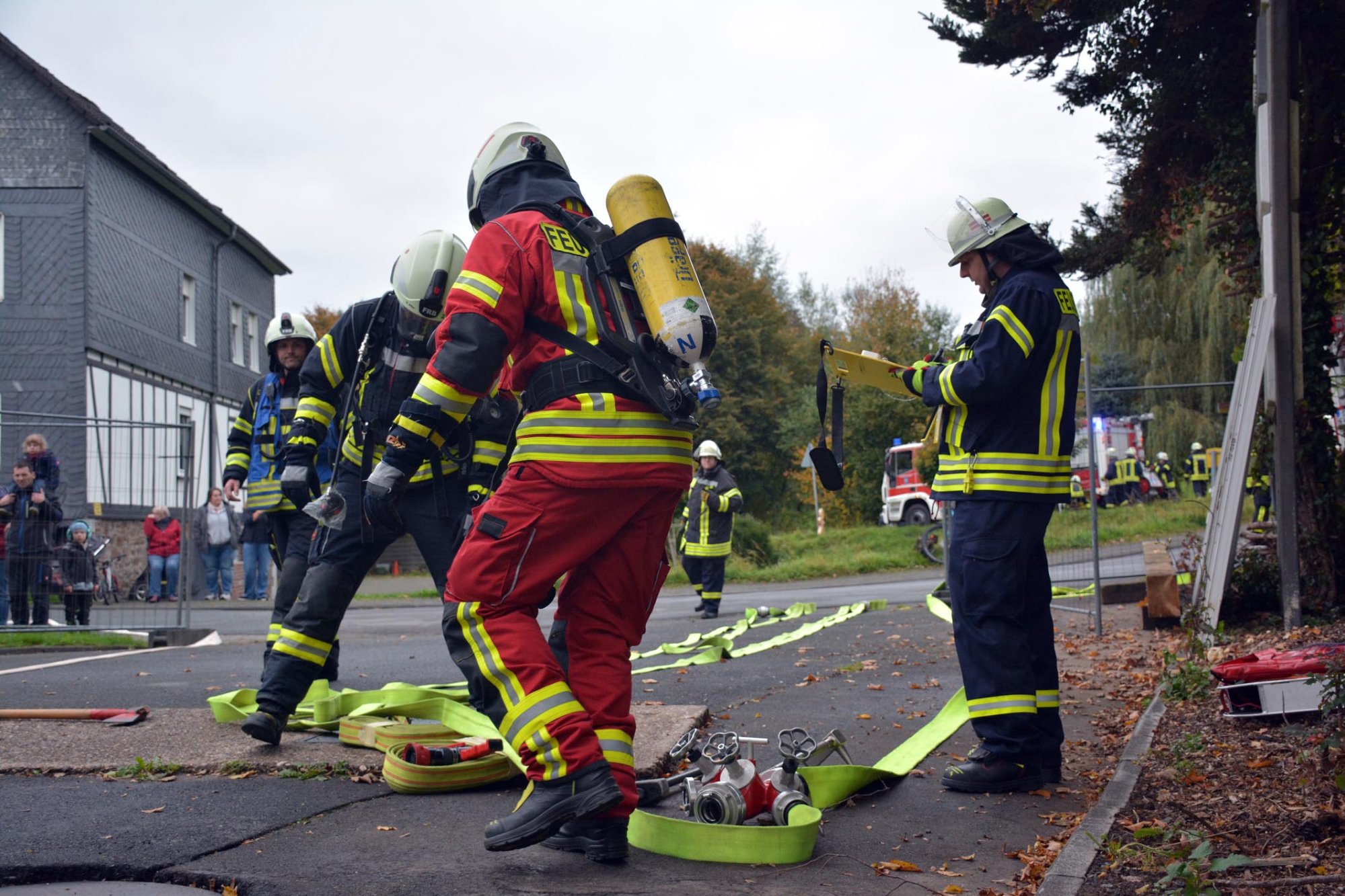 Moderiert wurde die komplette Herbstübung von Feuerwehr-Pressesprecher Dietmar Kalteich. Zum Abschluss des öffentlichen Teils der Übung begleitete ebenfalls traditionell der CVJM-Posaunenchor Büschergrund mit zwei Vortragsstücken die Feuerwehr.