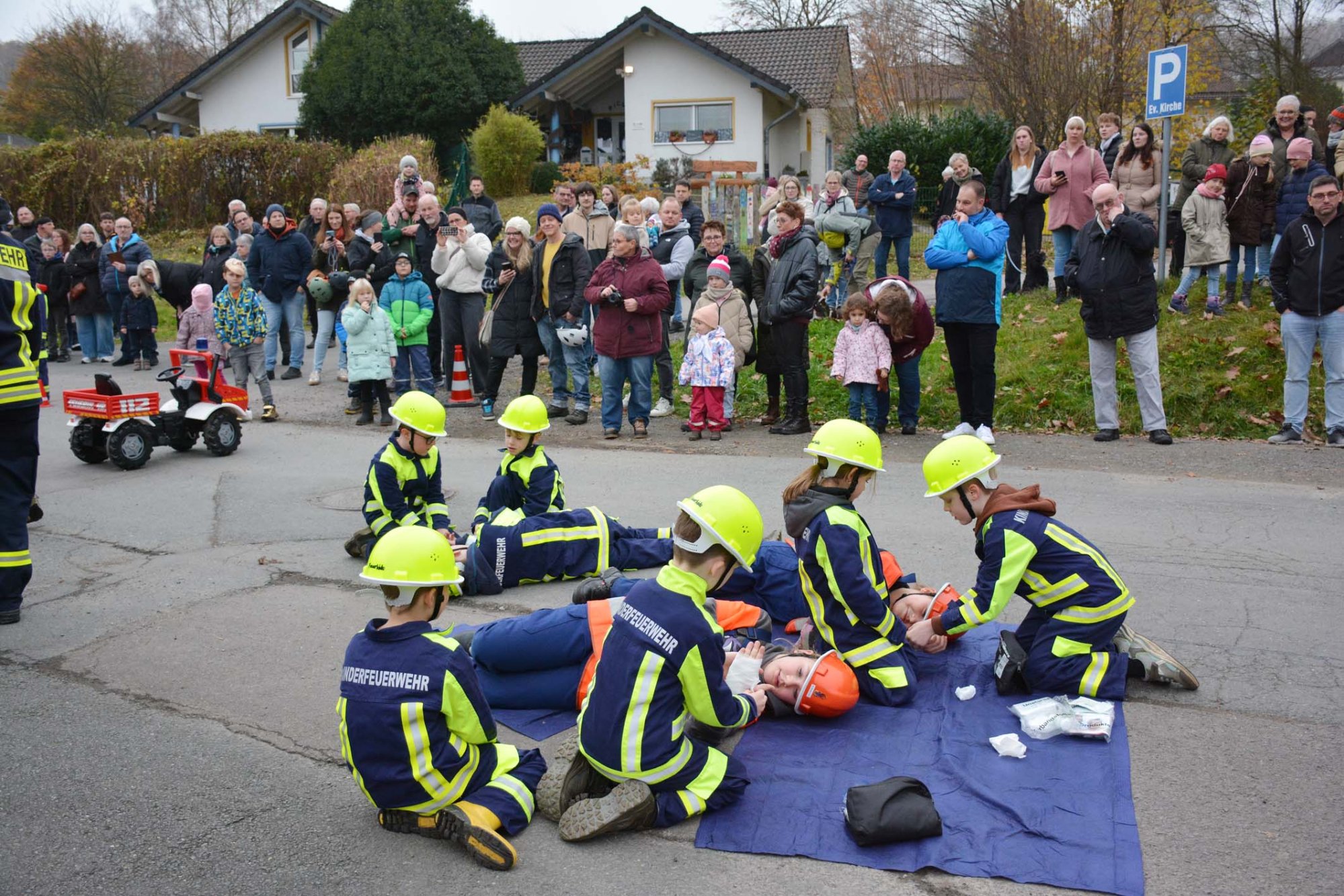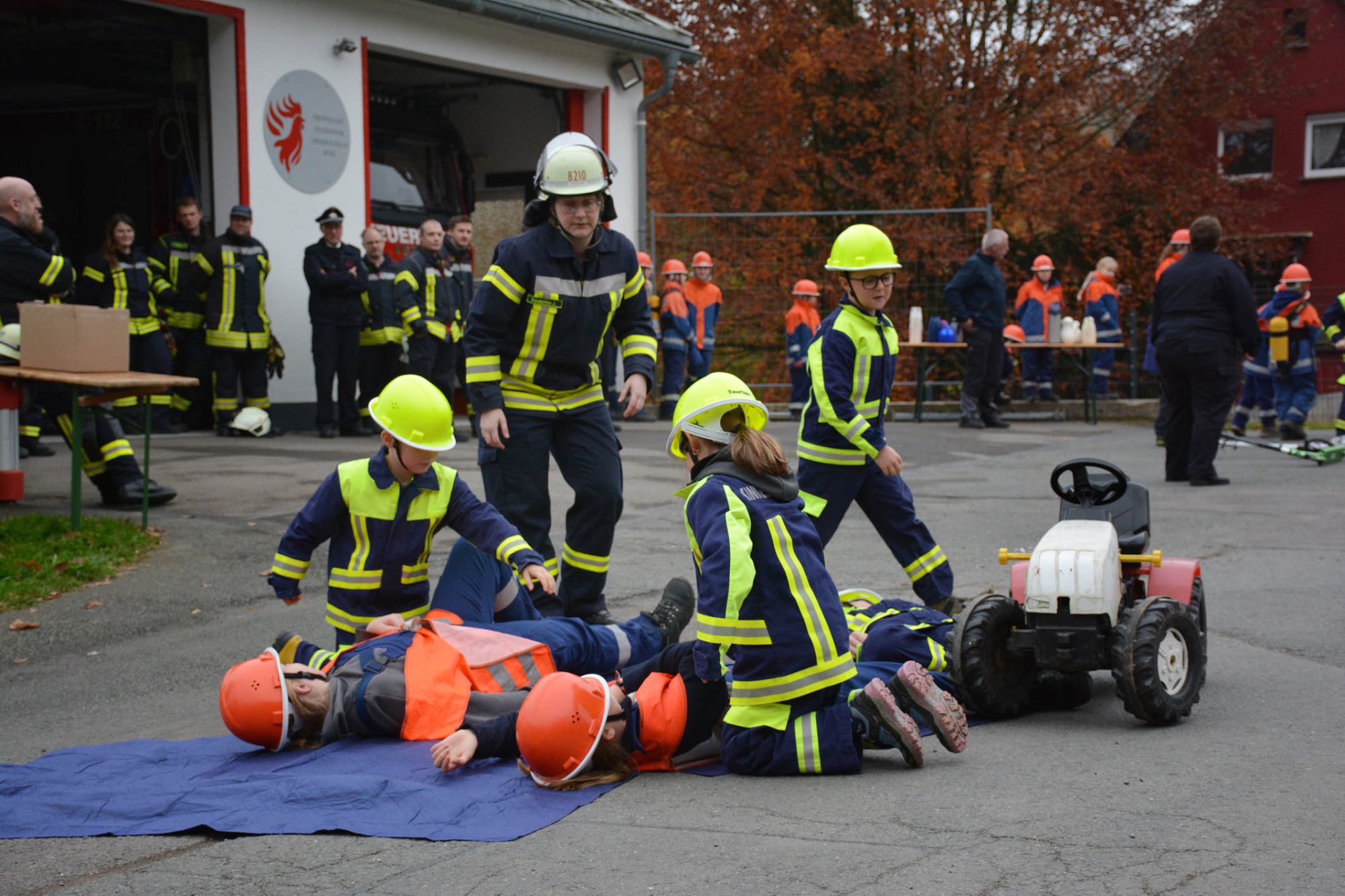 Nächster Programmpunkt war eine Übung der Kinderfeuerwehr. Bei einem nachgestellten Unfall hatte der Fahrer eines Kindertraktors zwei Bauarbeiter angefahren, die dabei verletzt wurden. Auch der Fahrer des Traktors verletzte sich hierbei. Ein Notruf wurde abgesetzt und die "Feuergeister" rückten zum Einsatzort aus.