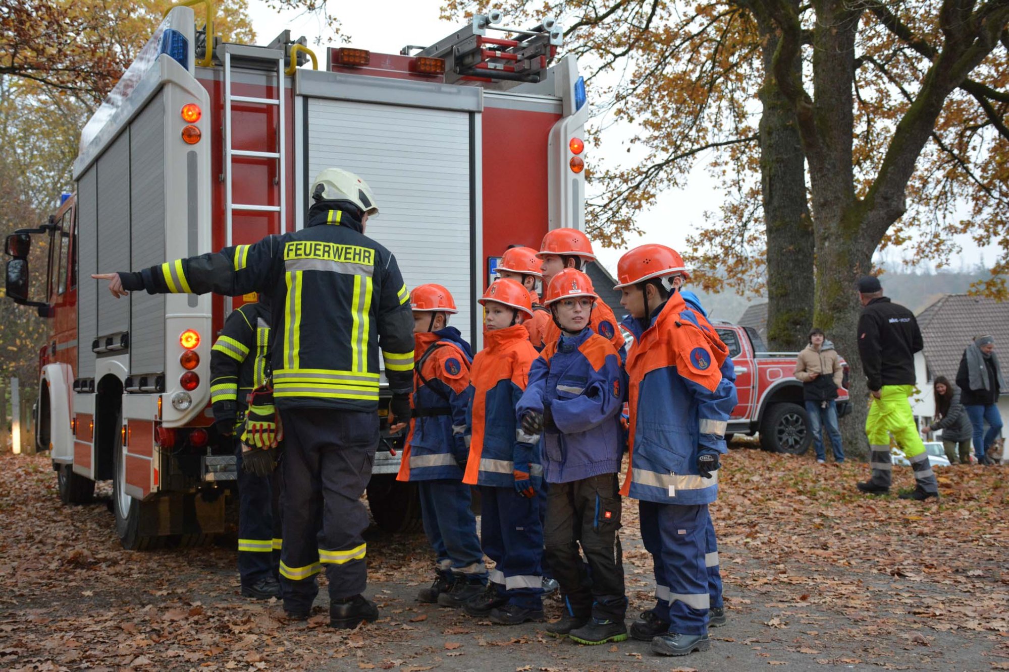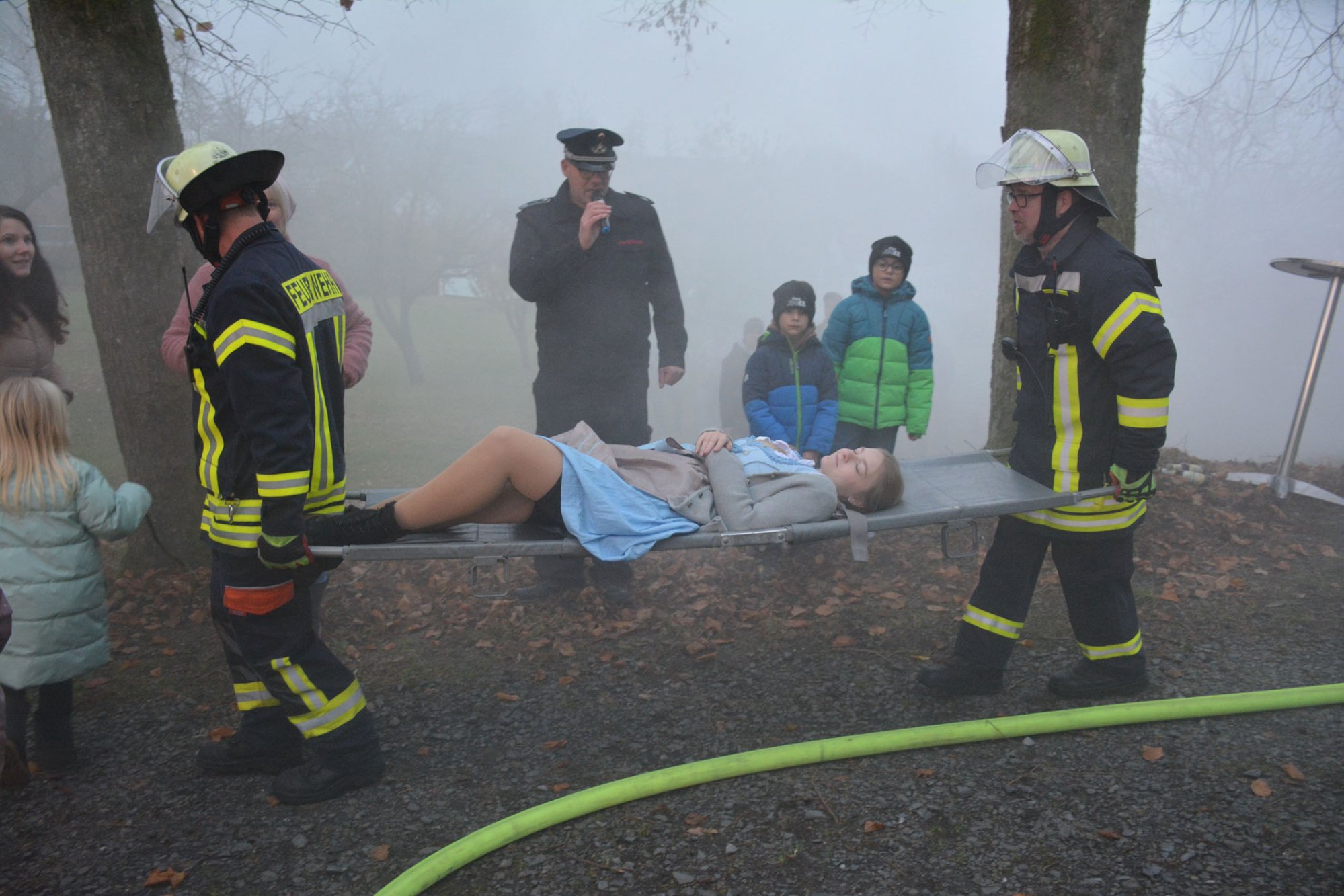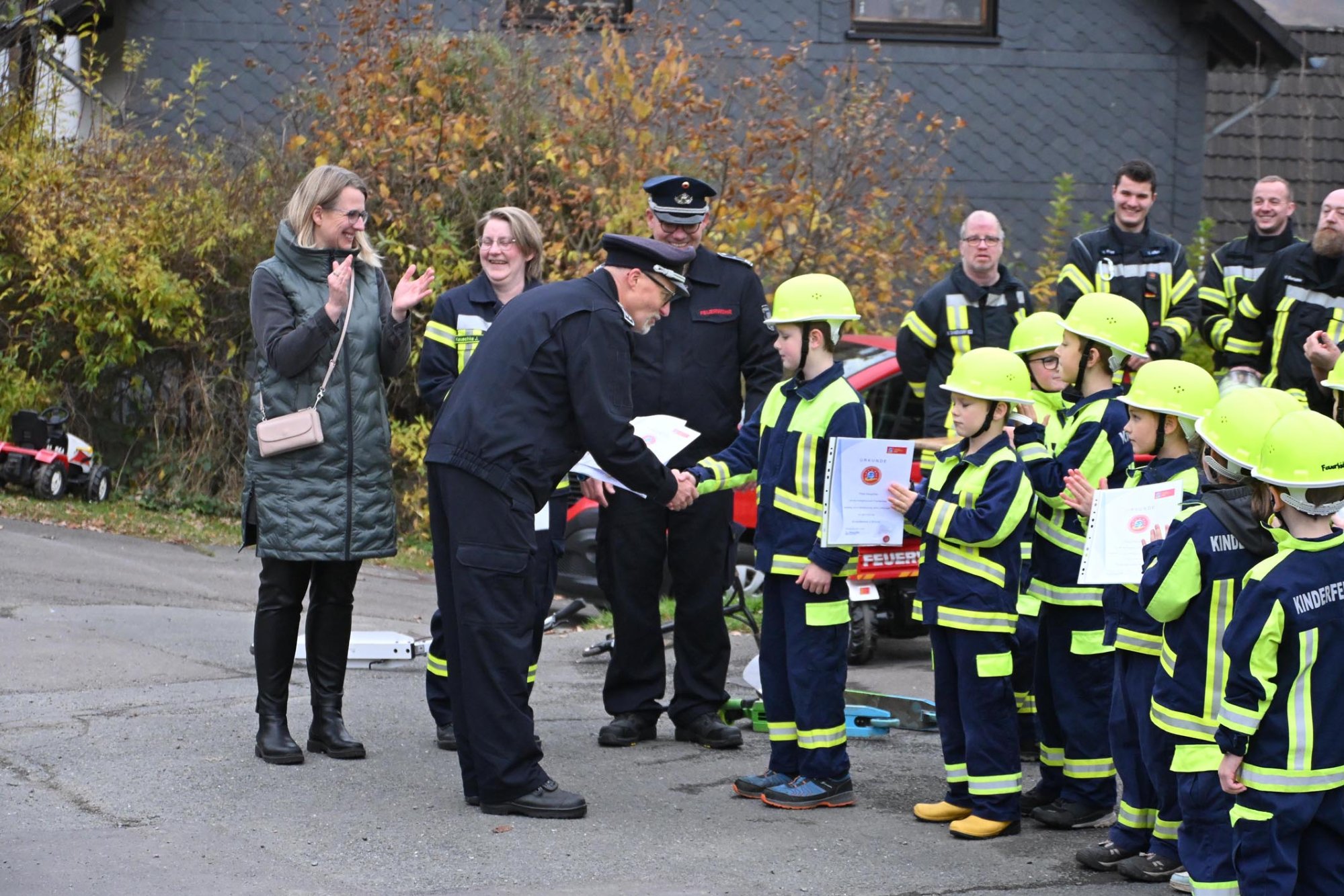 Auf der Anfahrt wurde gezeigt, wie eine Rettungsgasse funktioniert, anschließend die Einsatzstelle abgesichert und die Verletzten Bauarbeiter versorgt. Im Anschluss wurden folgende Mitglieder der Kinderfeuerwehr für die Teilnahme an der Kinderflamme ausgezeichnet. Im Anschluss gab es zudem eine Überraschung: Durch eine Spende der Firma Holzeinschlag Saßmannshausen konnten Wintermützen angeschafft und überreicht werden.