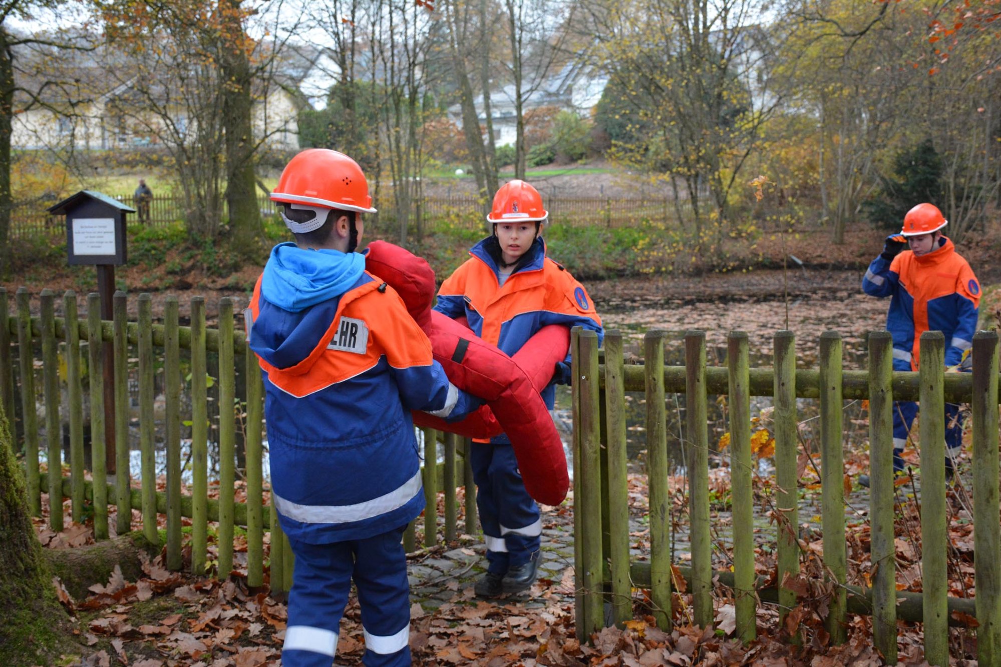 Die Übung der Jugendfeuerwehr fand am alten Backes neben dem Pfarrweiher statt. Hier kam es zu einer angedeuteten Mehlstaubexplosion, bei der das Gebäude Feuer fing. Personen, die sich im Backes befanden, konnten sich ins Freie retten und mit einem Schlauchboot in Sicherheit bringen. Dort wurden sie von der Feuerwehr in Empfang genommen, gleichzeitig wurde der Brand gelöscht.
