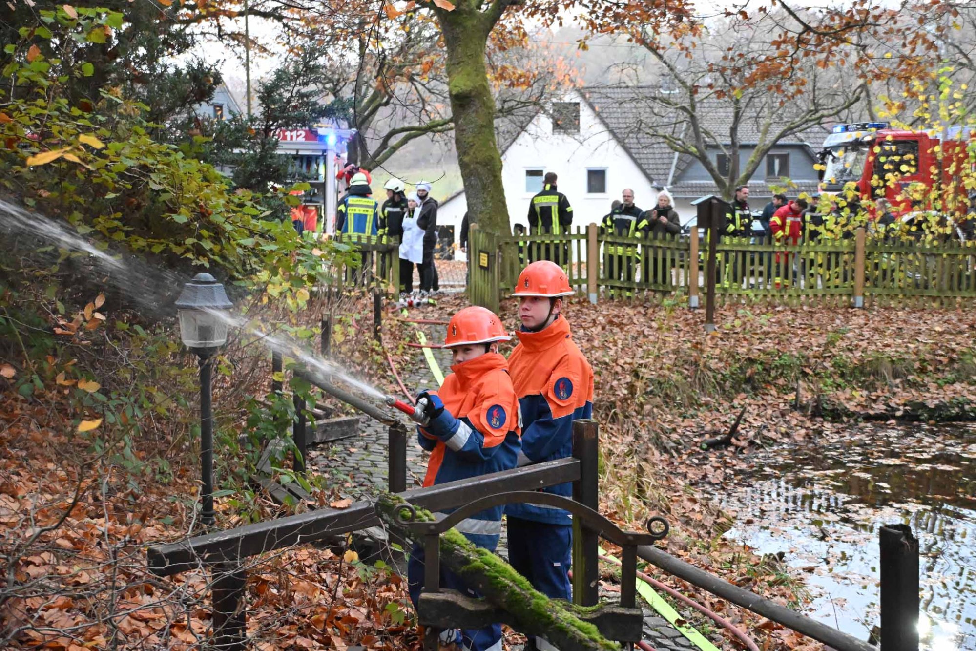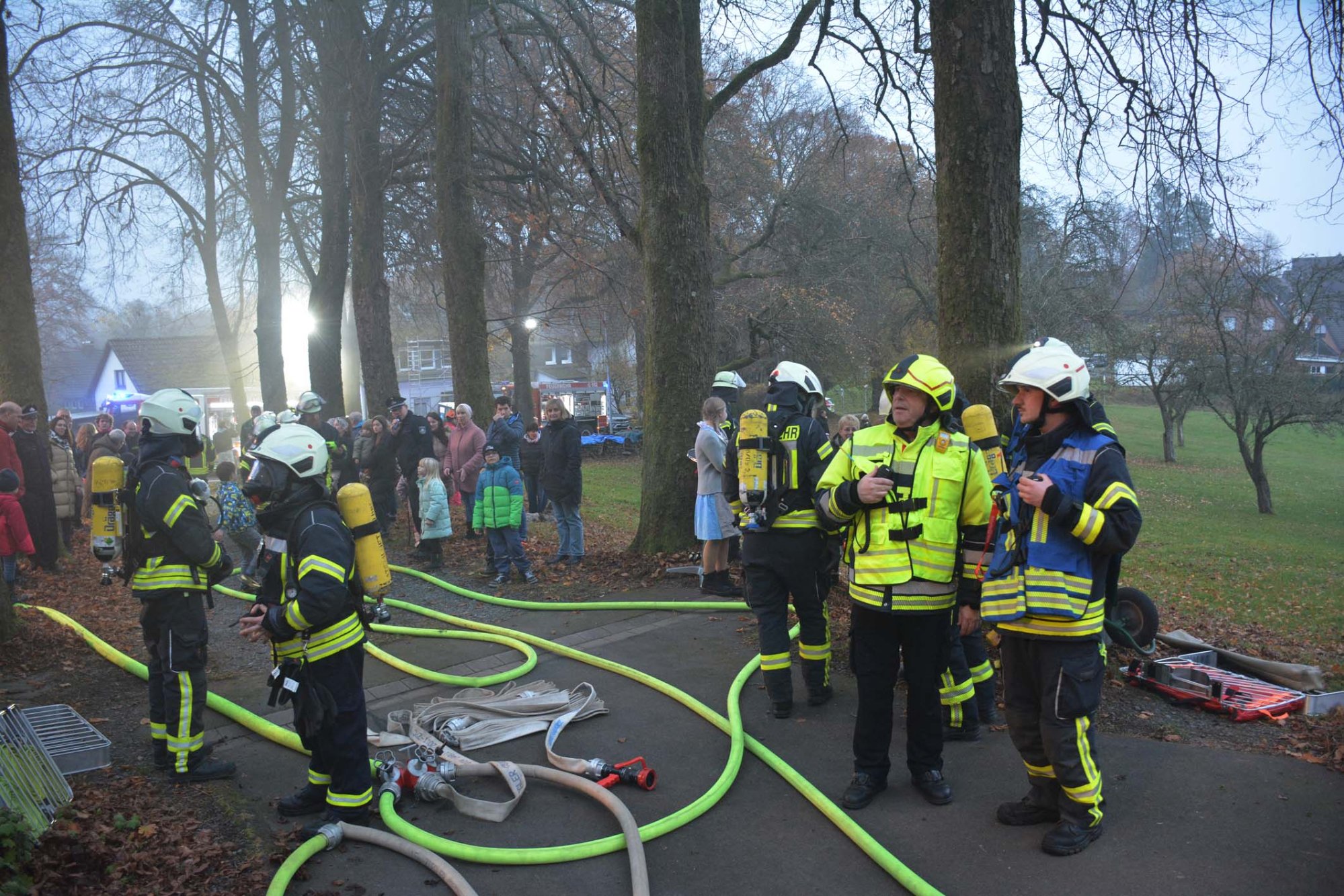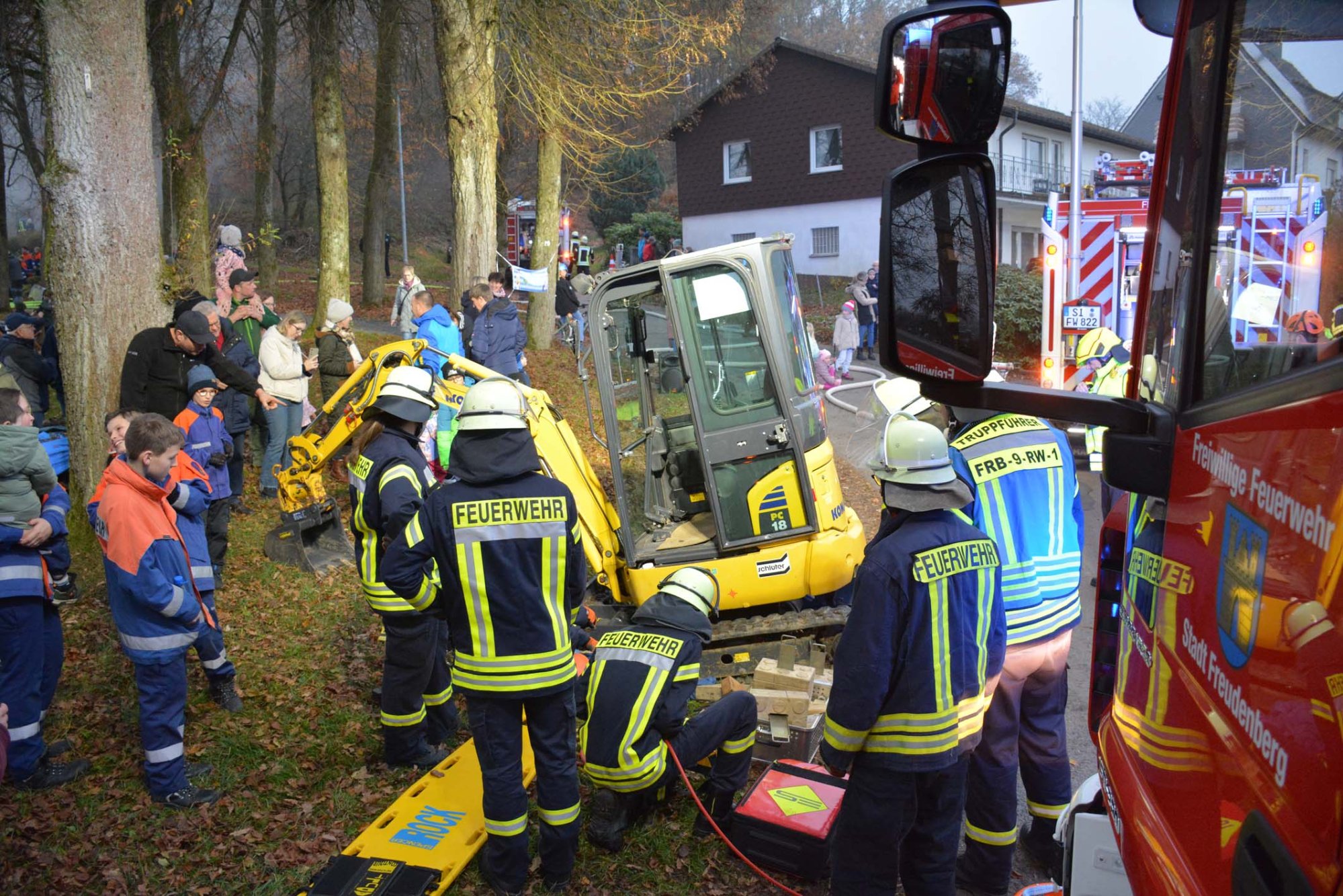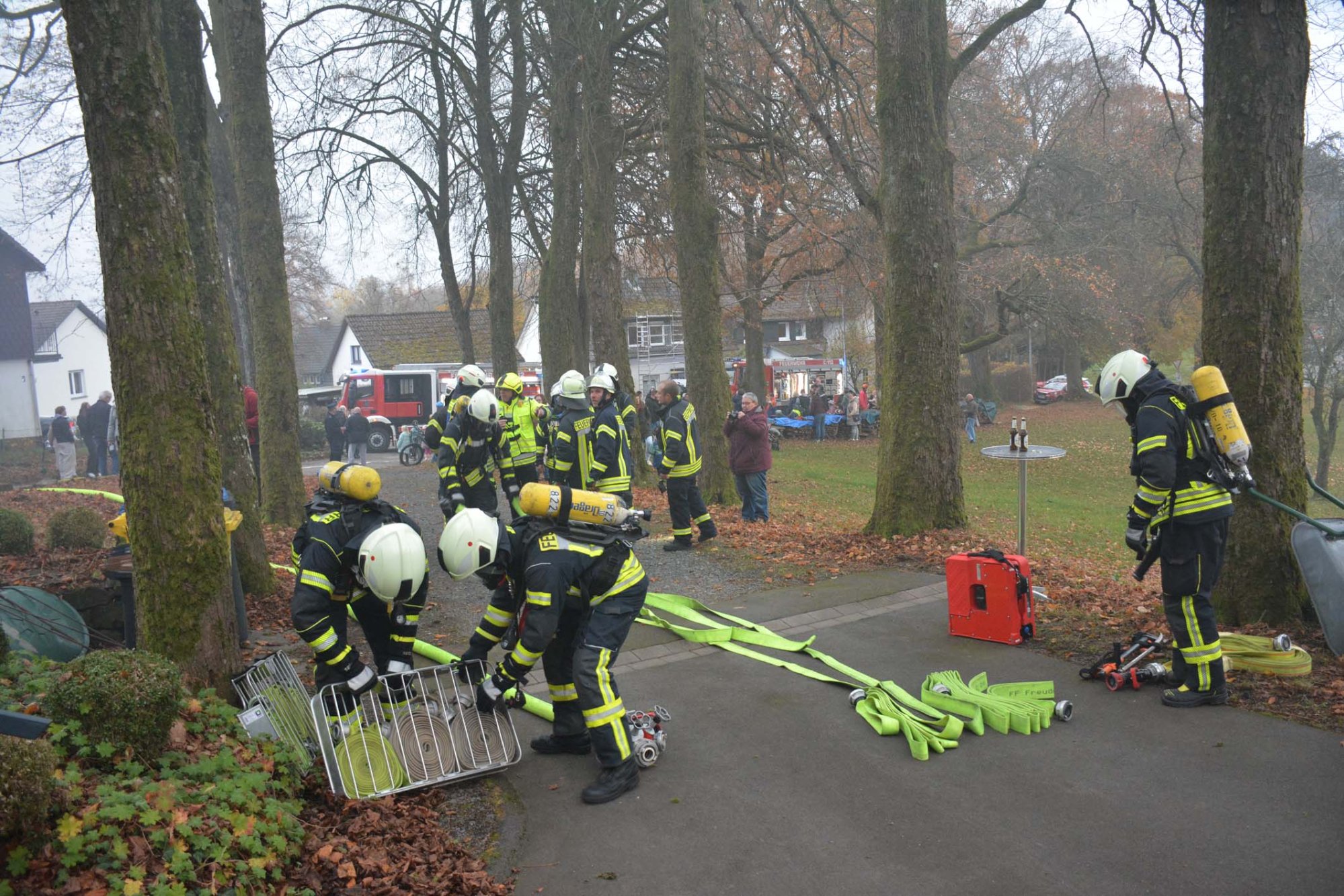 Die diesjährige Übung der Einsatzabteilung fand „Auf der Linde“ statt. Folgendes Szenario hatten sich die Verantwortlichen als ausgedacht: Auf dem traditionellen „Oberholzklauer Oktoberfest“ kommt es in einem Gebäude zu einer Verpuffung. Ein Feuer bricht aus setzt Teile des Gebäudes in Brand. Drei Personen werden dabei im Gebäude vermisst und müssen gerettet werden. Abgelenkt durch das Feuer im benachbarten Gebäude überfährt ein Baggerfahrer einen Kollegen, der unter dem Bagger eingeklemmt wird.