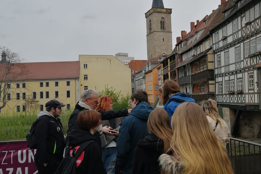Nach Köln im Sommer vorigen Jahres und Hadamar im Oktober bildete die Tour nach Erfurt den dritten Teil der Gedenkstättenfahrten, die auch diesmal durch den Kreisjugendring Siegen-Wittgenstein gefördert wurden. In Erfurt stand aber zunächst eine interessante Stadtführung auf dem Programm, bei der die Altstadt zum Verweilen und gemeinsame freie Zeit einlud, aber auch gleichzeitig das jüdische Leben zu Beginn des 20. Jahrhunderts beleuchtete.