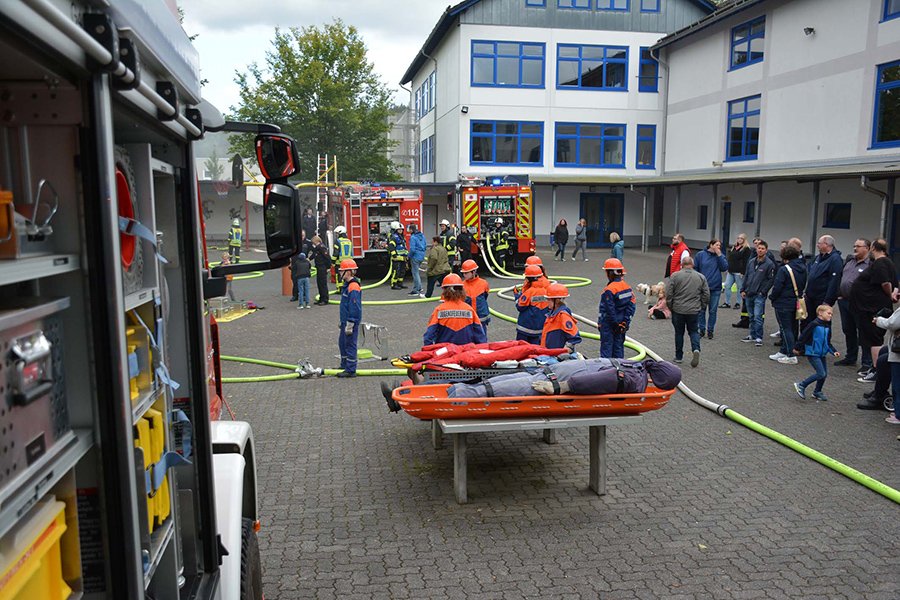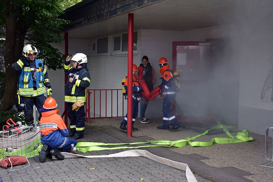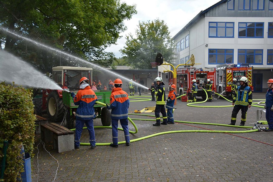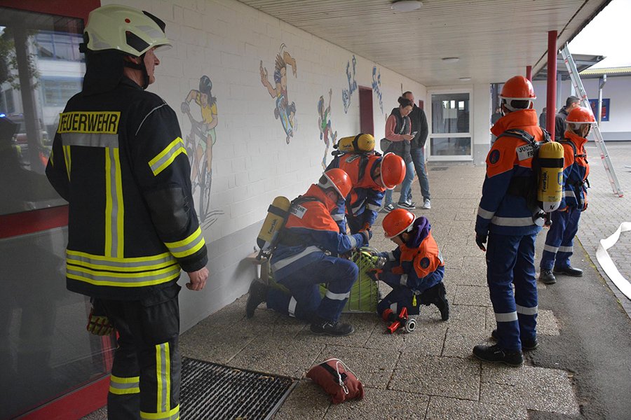 Nach dem Eintreffen der Einsatzkräfte wurde erst einmal die Lage vor Ort erkundet und dann der Einsatzbefehl an die verschiedenen Gruppen erteilt. Dazu wurden verschiedene Gruppenabschnitte eingerichtet. Gruppe 1 wurde zur Brandbekämpfung und Menschenrettung in der Turnhalle eingesetzt. Parallel wurde ein Dachdecker unter Zuhilfenahme der zweiteiligen Steckleiter vom Dach gerettet. Zudem musste die Wasserversorgung vom oberen Parkplatz zum Schulhof aufgebaut werden.