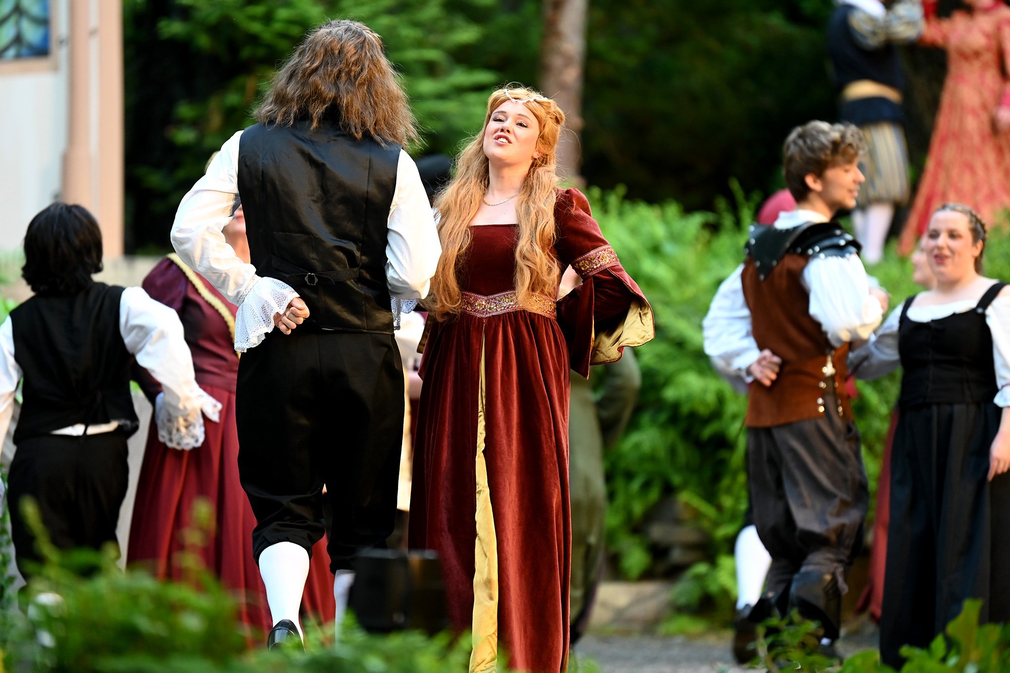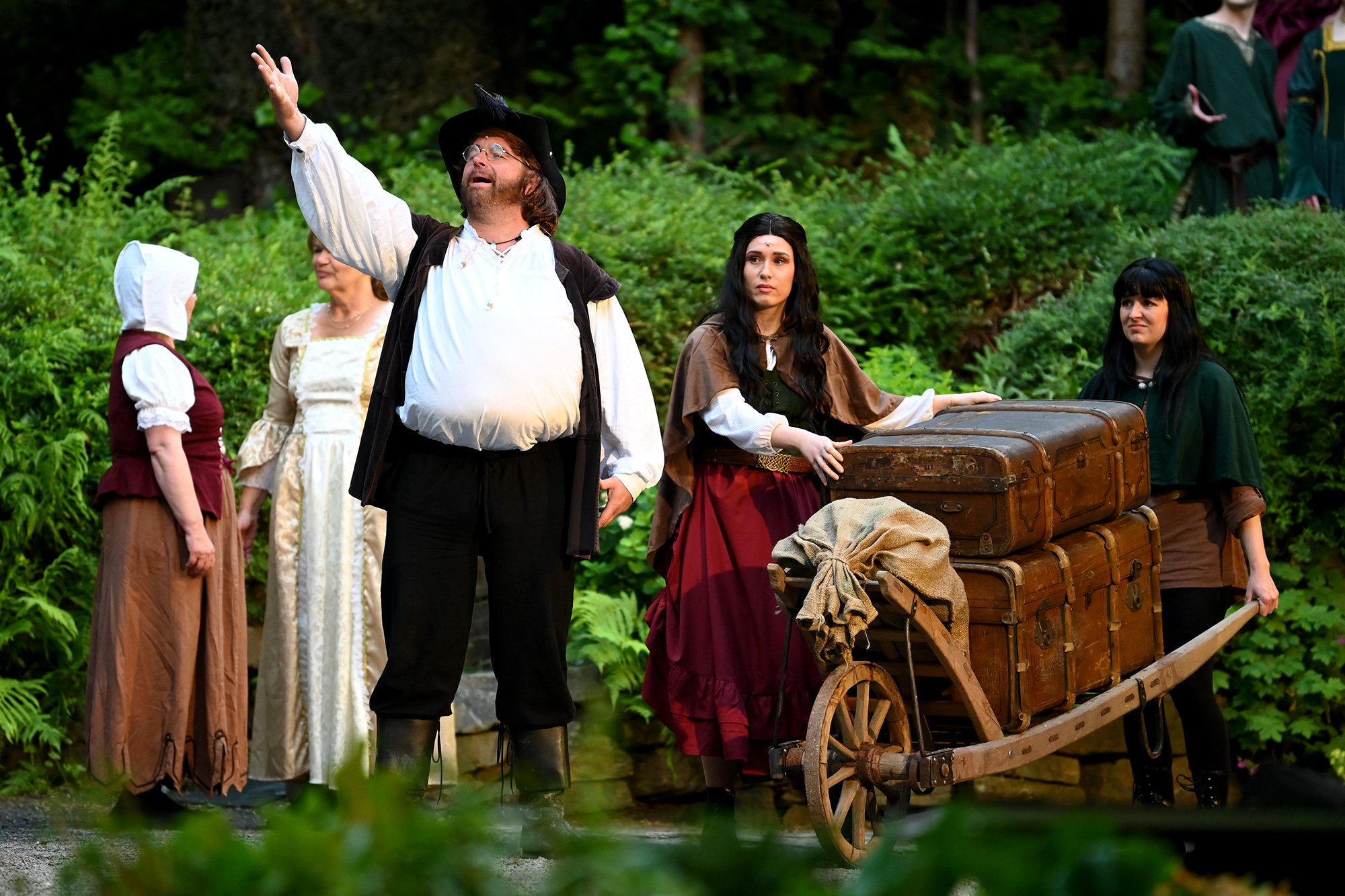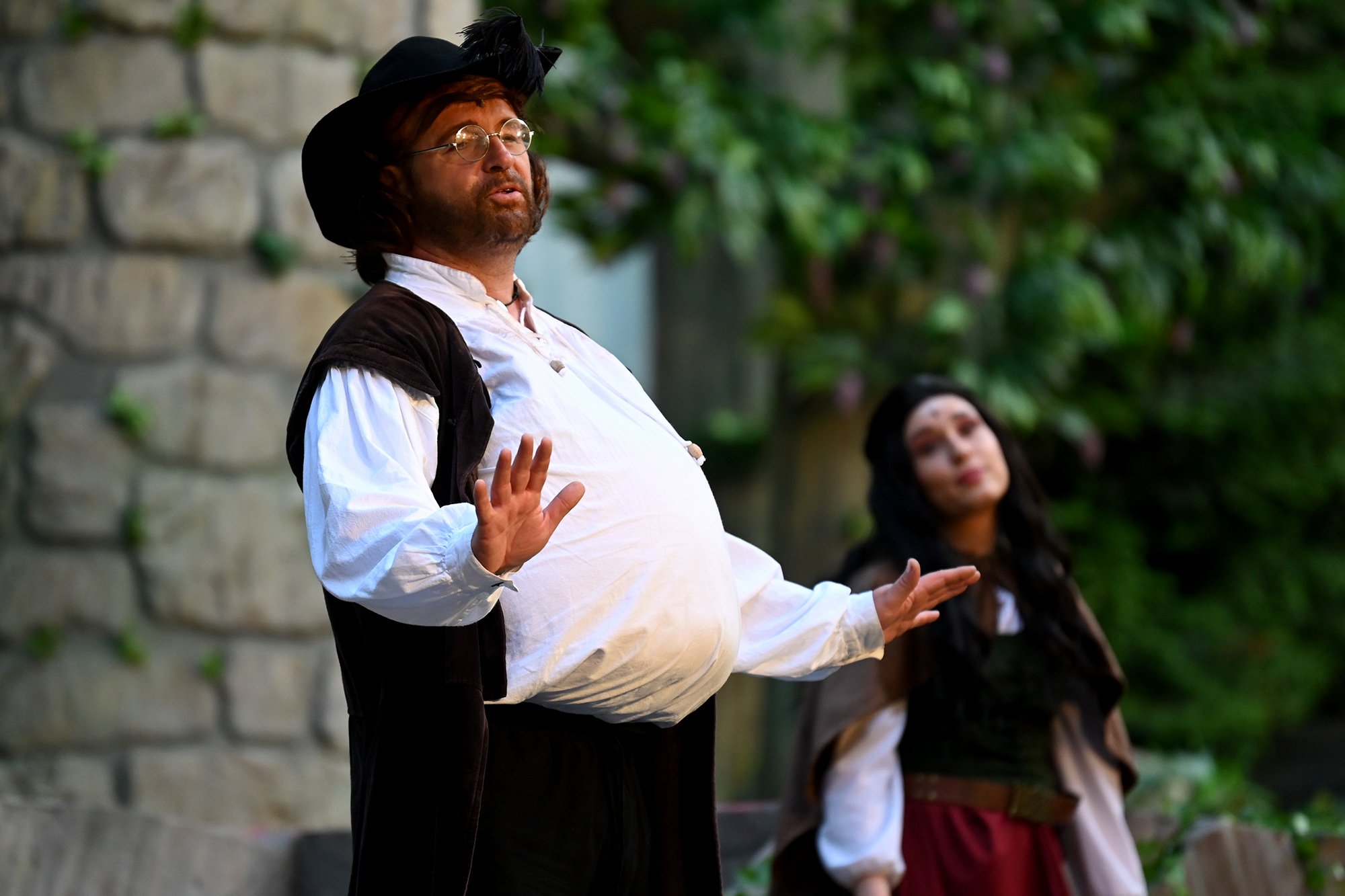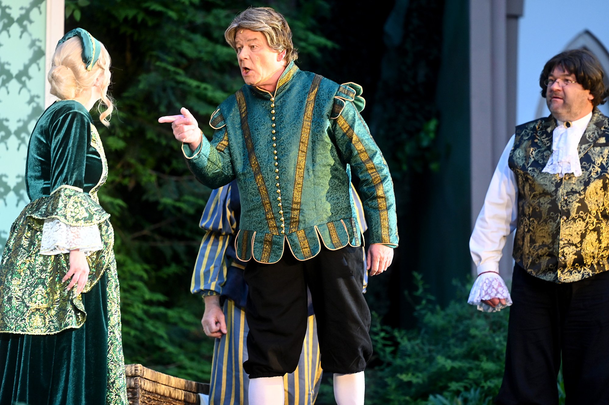 Parallel dazu soll Anne, die Tochter einer der angesehenen Aristokratinnen, verheiratet werden. Aber mit dem eitlen Doktor Cajun (Tim Müller), der sich mit großer Hingabe seinen Kotletten widmet, und Sir Hugh Evans (Frank Kölsch), der eher mit seinem hinreißenden walisischen Akzent als mit Tapferkeit und Leidenschaft glänzt, sind die Alternativen eher bescheiden. Aber schließlich ist da ja noch Fenton (Jochen Kretzer), der nicht nur als Feingeist brilliert, sondern in Person William Shakespeares dem Stück den erzählerischen Rahmen gibt. Seine Königin ist am Ende begeistert und würde den Stoff gerne einem englischen Theater anbieten. Der ist allerdings schon einer Freilichtbühne in Deutschland vesprochen...