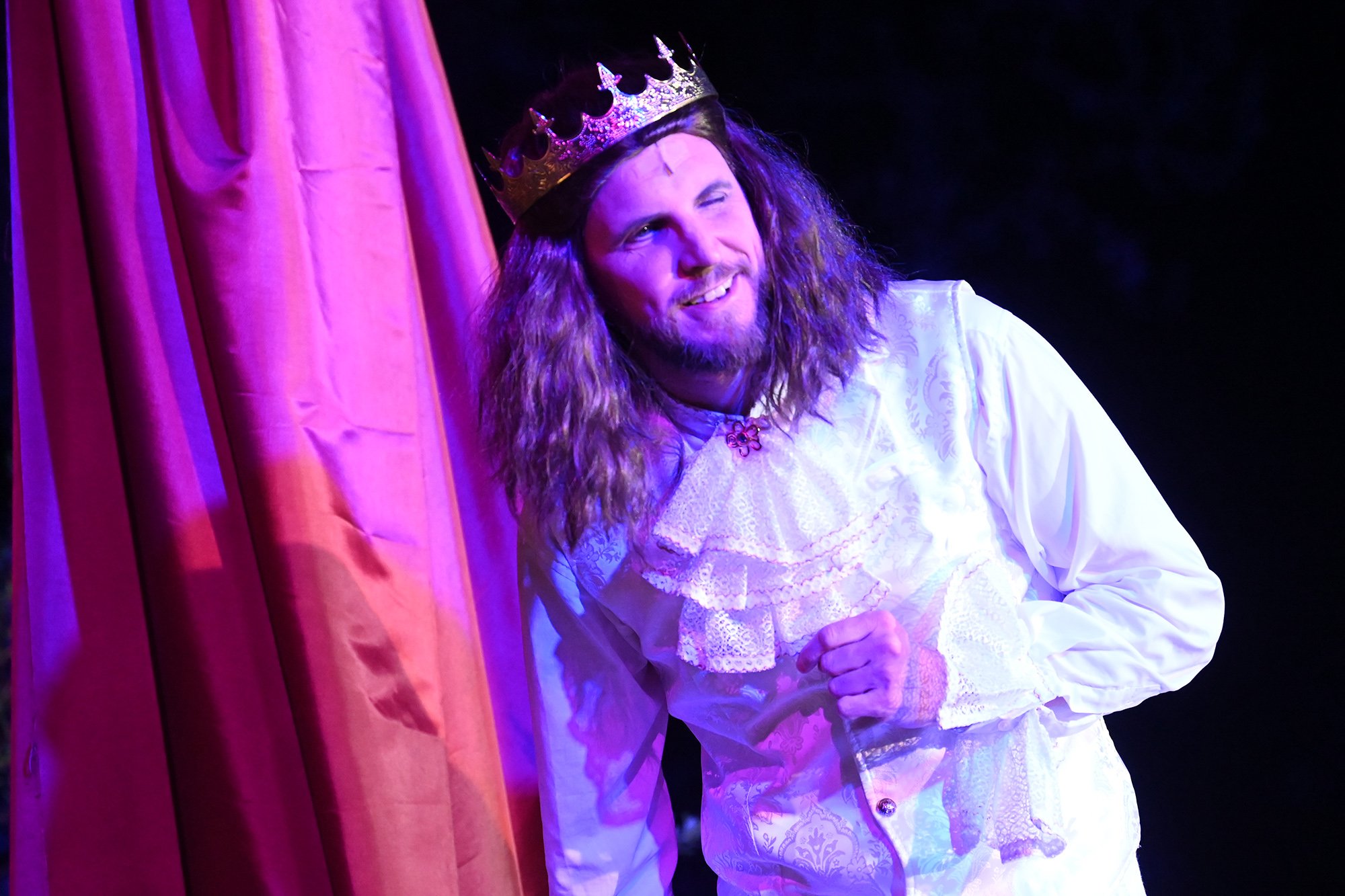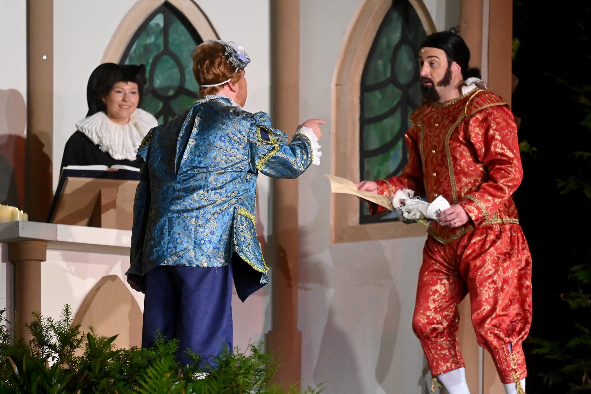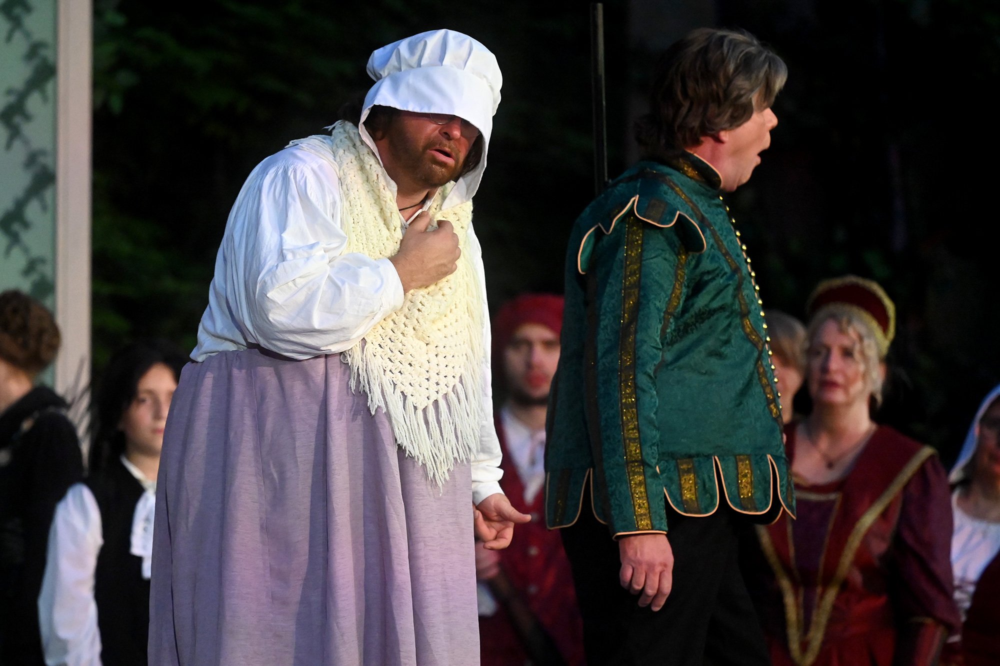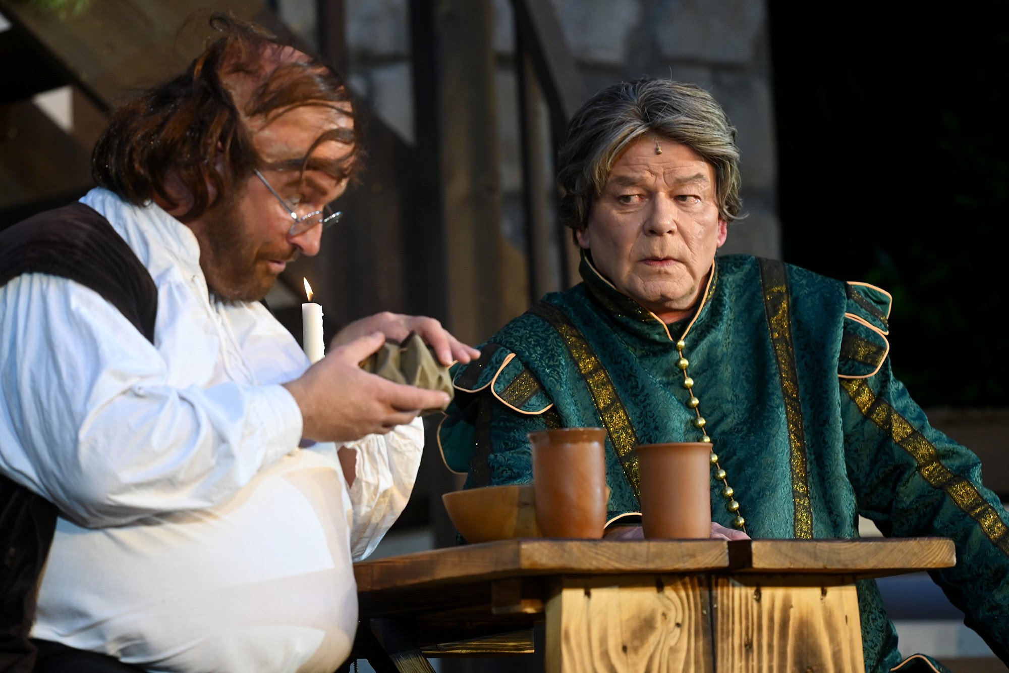 Parallel dazu soll Anne, die Tochter einer der angesehenen Aristokratinnen, verheiratet werden. Aber mit dem eitlen Doktor Cajun (Tim Müller), der sich mit großer Hingabe seinen Kotletten widmet, und Sir Hugh Evans (Frank Kölsch), der eher mit seinem hinreißenden walisischen Akzent als mit Tapferkeit und Leidenschaft glänzt, sind die Alternativen eher bescheiden. Aber schließlich ist da ja noch Fenton (Jochen Kretzer), der nicht nur als Feingeist brilliert, sondern in Person William Shakespeares dem Stück den erzählerischen Rahmen gibt. Seine Königin ist am Ende begeistert und würde den Stoff gerne einem englischen Theater anbieten. Der ist allerdings schon einer Freilichtbühne in Deutschland vesprochen...
