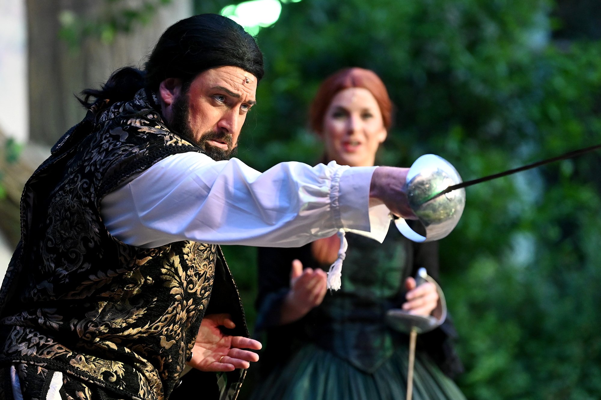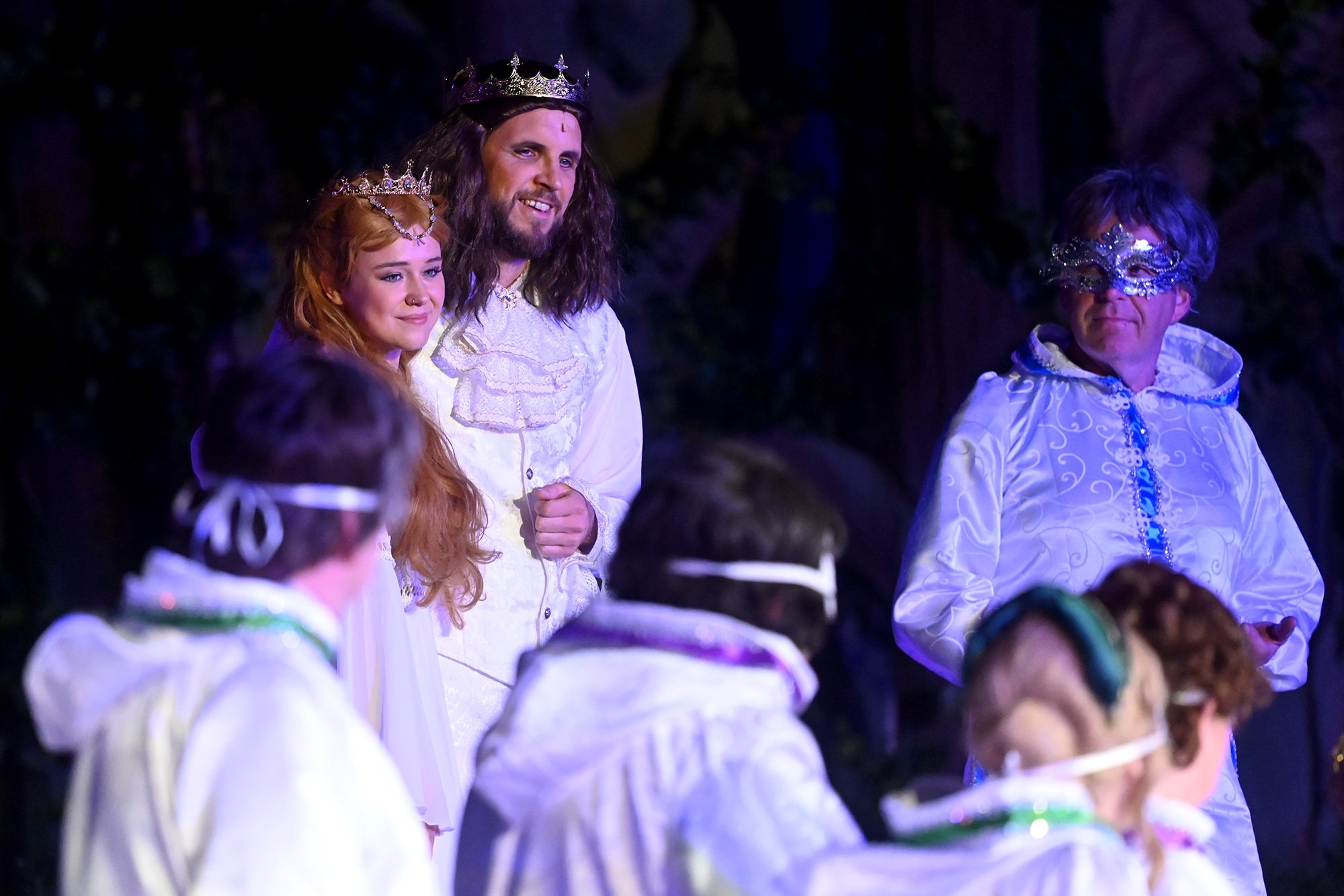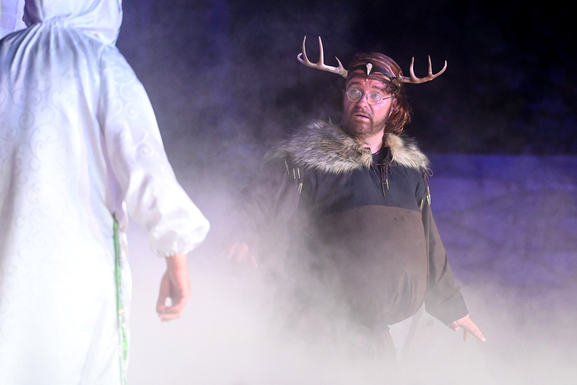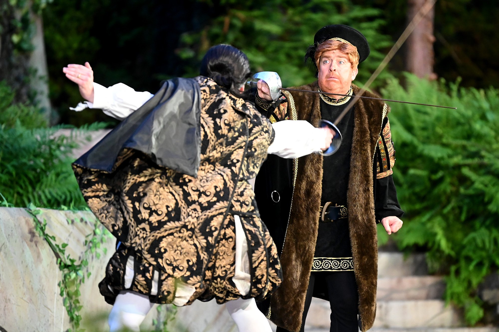 Parallel dazu soll Anne, die Tochter einer der angesehenen Aristokratinnen, verheiratet werden. Aber mit dem eitlen Doktor Cajun (Tim Müller), der sich mit großer Hingabe seinen Kotletten widmet, und Sir Hugh Evans (Frank Kölsch), der eher mit seinem hinreißenden walisischen Akzent als mit Tapferkeit und Leidenschaft glänzt, sind die Alternativen eher bescheiden. Aber schließlich ist da ja noch Fenton (Jochen Kretzer), der nicht nur als Feingeist brilliert, sondern in Person William Shakespeares dem Stück den erzählerischen Rahmen gibt. Seine Königin ist am Ende begeistert und würde den Stoff gerne einem englischen Theater anbieten. Der ist allerdings schon einer Freilichtbühne in Deutschland vesprochen...