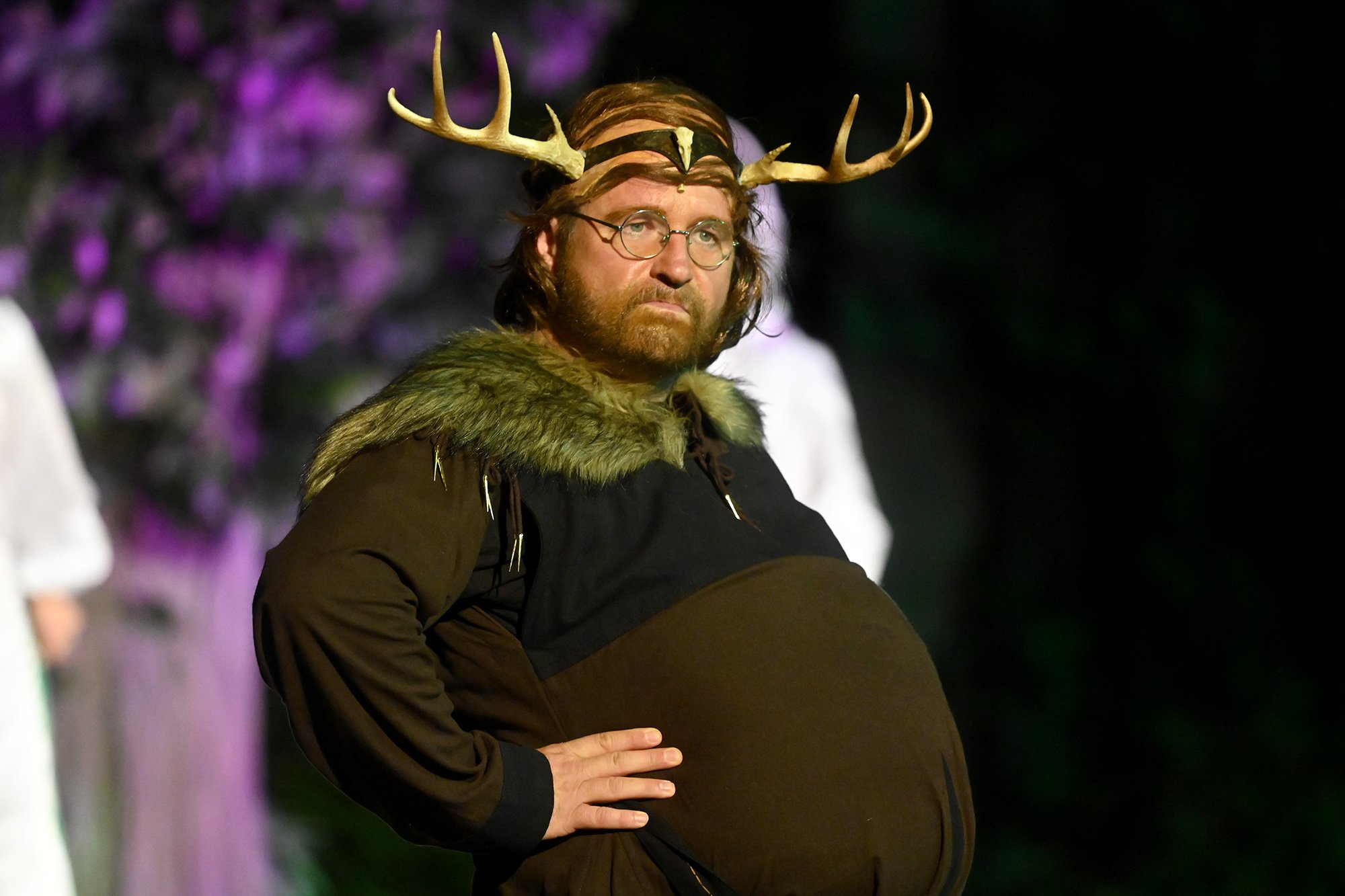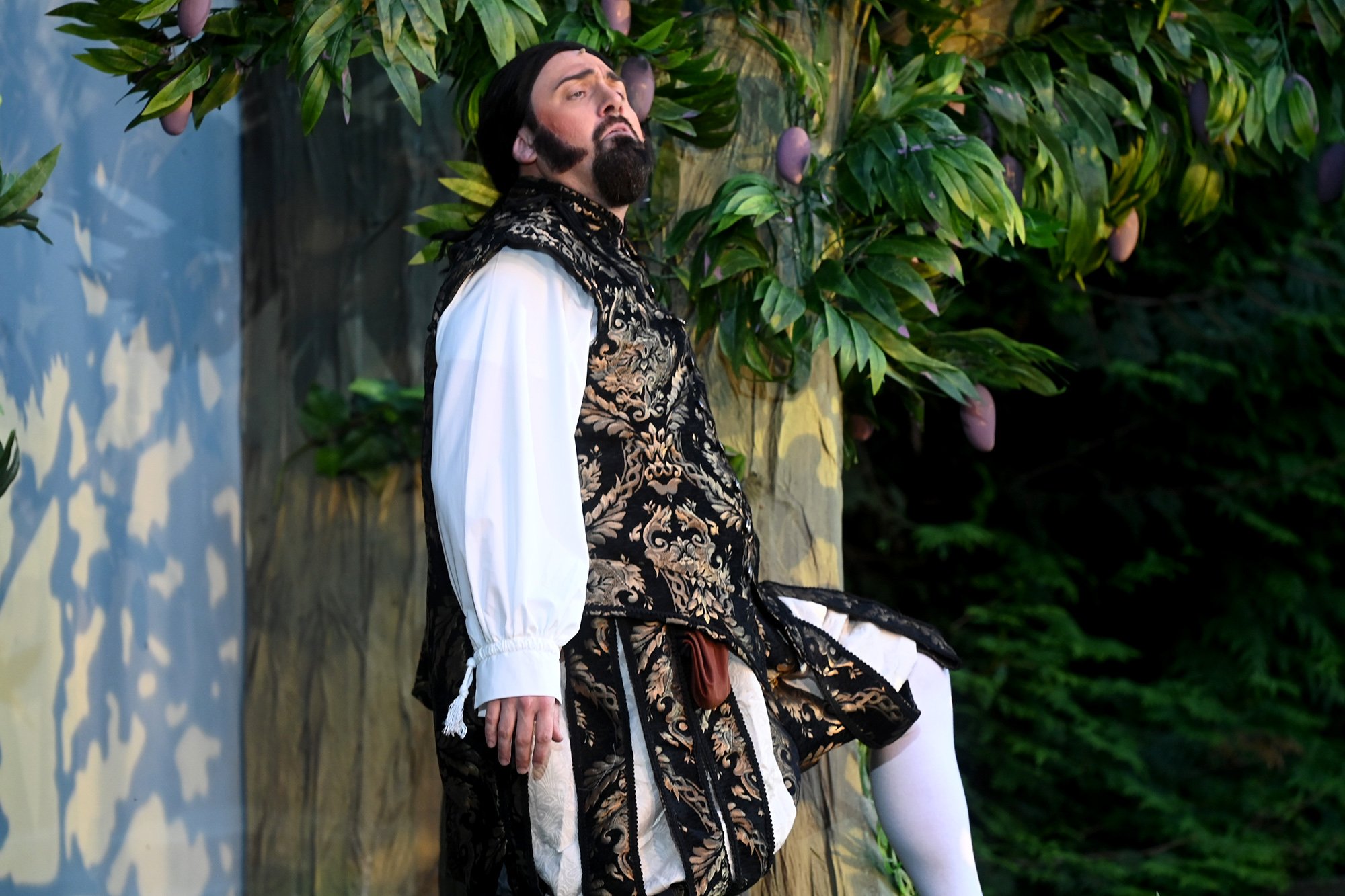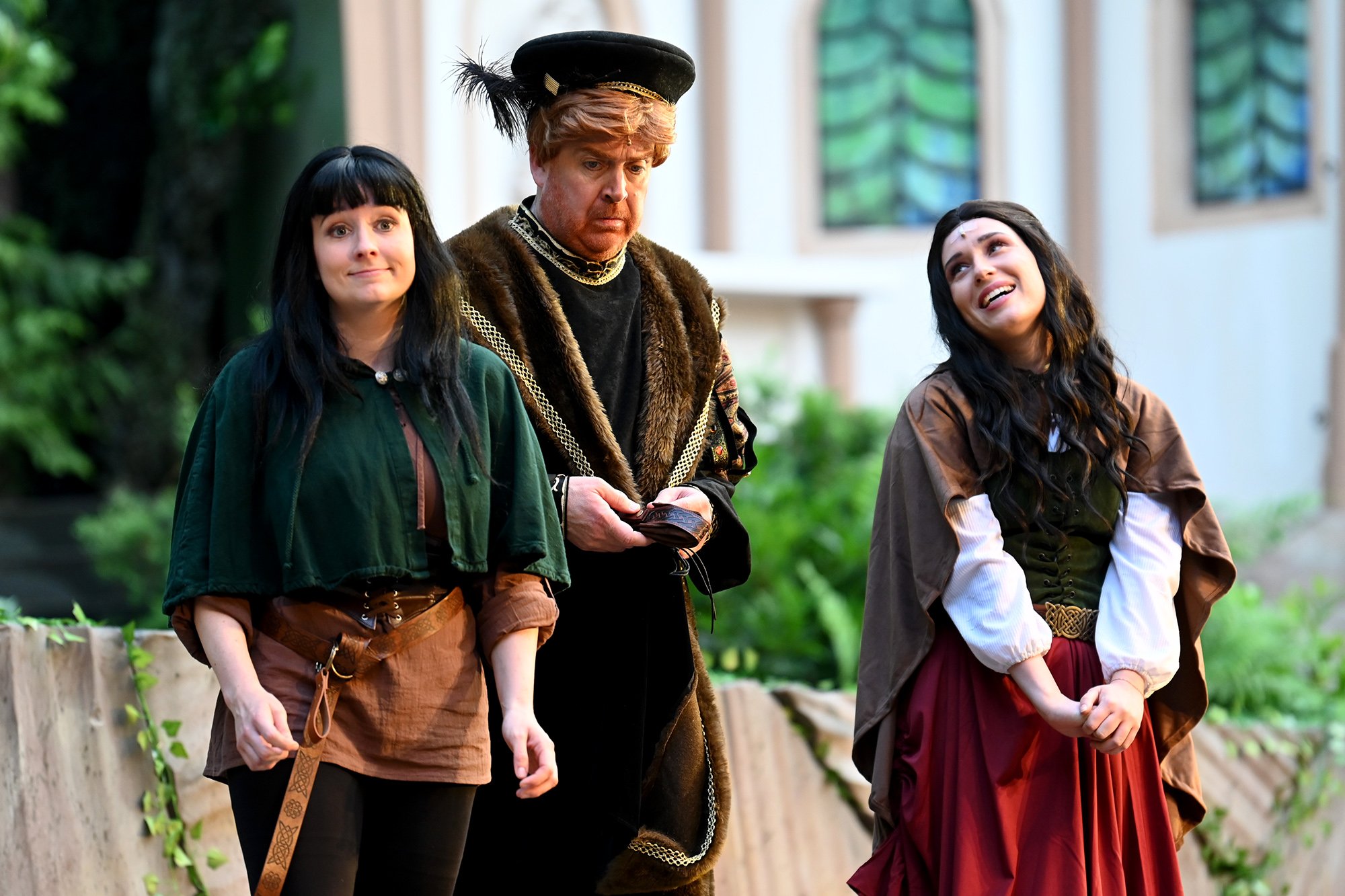 Auf der Bühne ging es dann ins England des 17. Jahrhunderts: Der selbstverliebte und bierbäuchige Ritter Falstaff (Kersten Schaab) versucht, gleich drei Frauen aus Windsors Upper Class zu bezirzen und ihnen am Ende das Geld aus der Tasche zu ziehen. Der Plan wird jedoch schnell durchschaut und anstatt sich auf den selbsternannten Frauenheld einzulassen, geben ihn die Damen gleich mehrfach dem Gespött preis und verjagen ihn letztlich aus der Stadt.