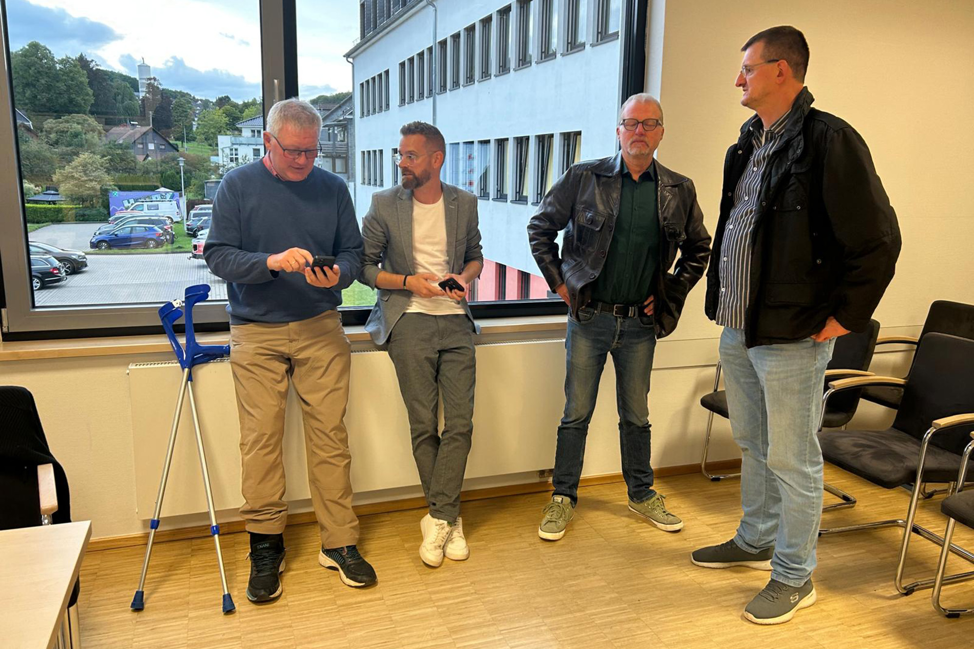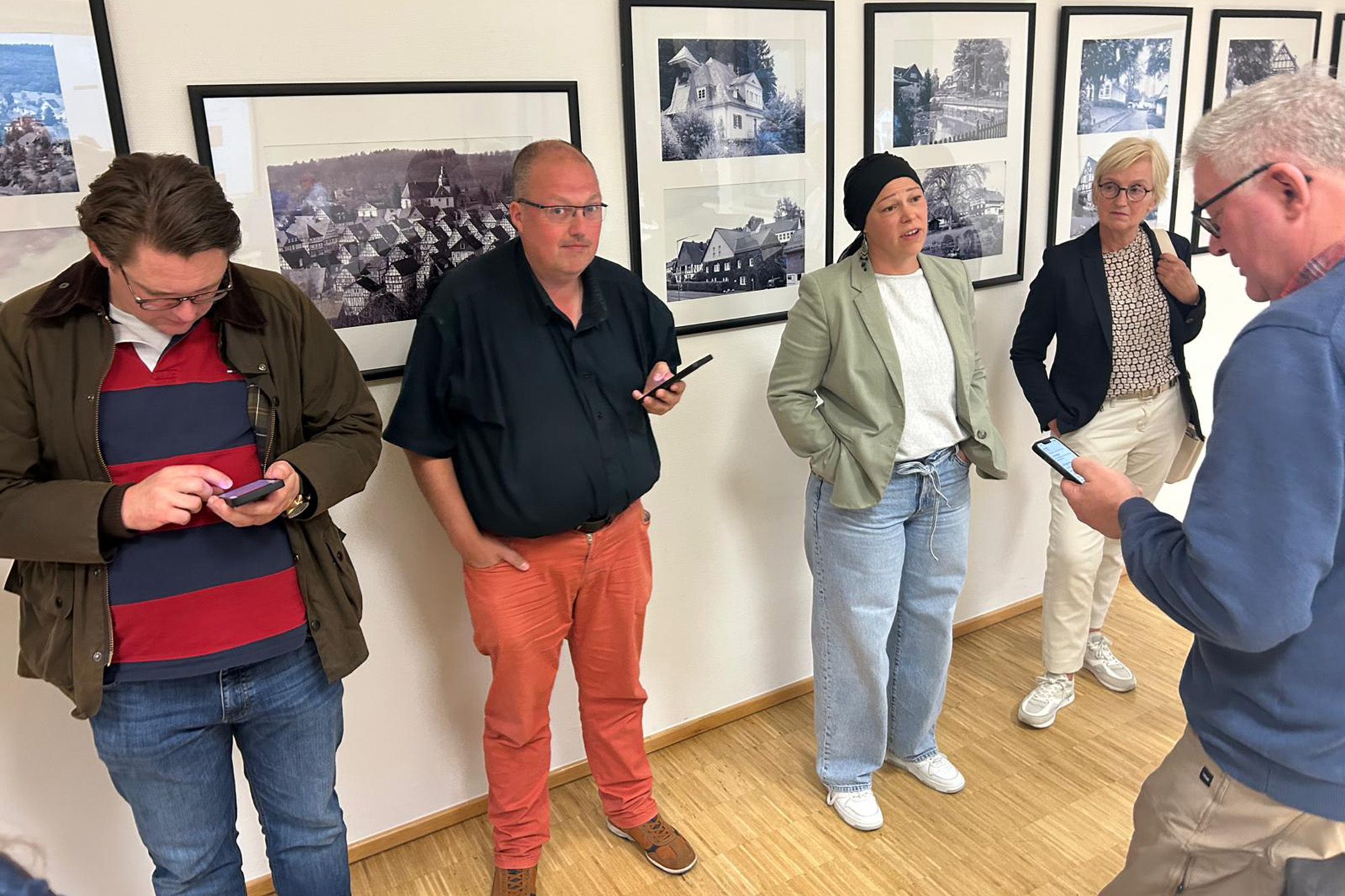 Aktuell trudeln Kommunalpolitiker und interessierte Bürgerinnen und Bürger im Rathaus ein, darunter Feuerwehrchef Rainald Thiemann (2.v.r.), der aber nicht befürchtet, heute Abend politische Brände löschen zu müssen.