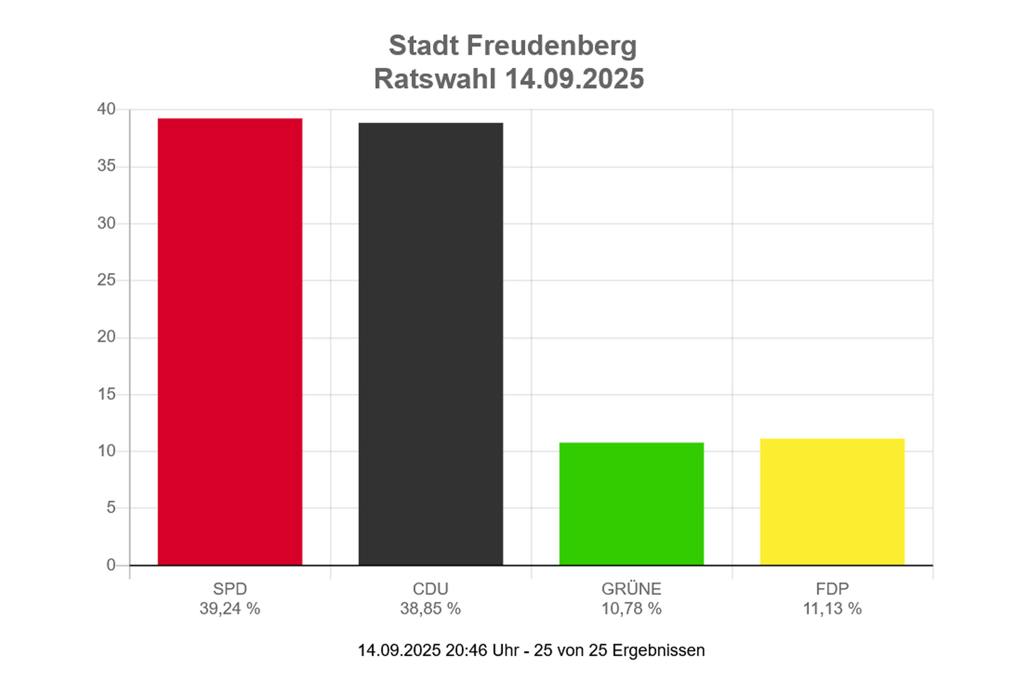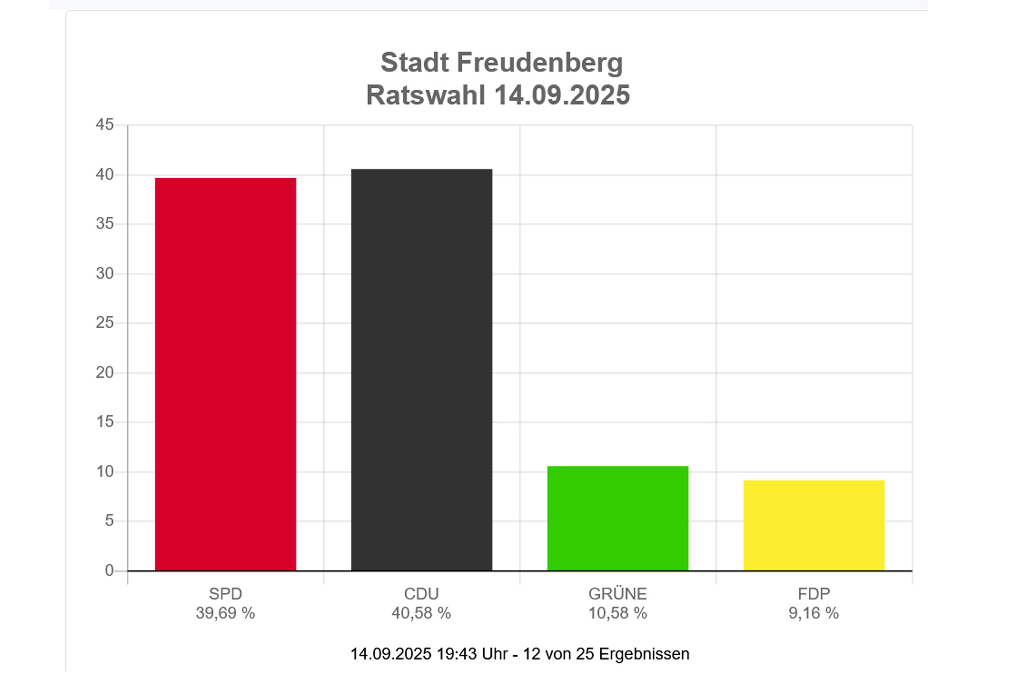 Auch die Wahl zum Freudenberger Stadtrat ist inzwischen ausgezählt: Die SPD gewinnt hauchdünn mit 39,24 % oder der CDU mit 38,85 %. Die FDP kommt auf 11,13 % vor Bündnis 90 / Die Grünen mit 10,78 %. Die Sitzverteilung ist damit völlig ausgeglichen: SPD und CDU erhalten 13 Sitze, FDP und die Grünen jeweils 4 Sitze im Rat.