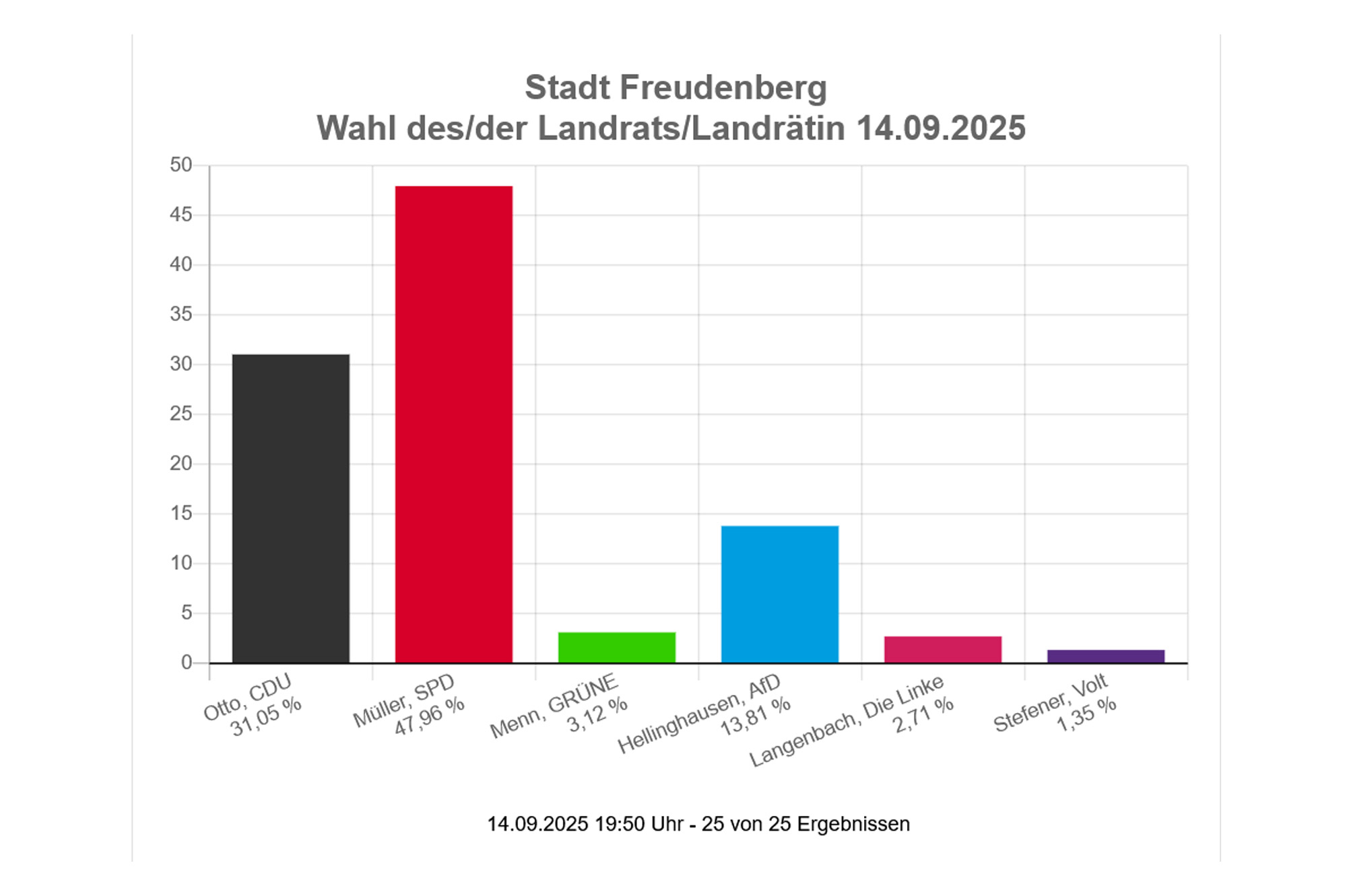 Die Wahl zum Landrat/zur Landrätin ist zumindest in Freudenberg fertig ausgezählt. Kreisweit kommt Andreas Müller nach 243 von 318 Ergebnissen "nur" auf 44,31 % vor Susanne Otto mit 29,76 %. Hier scheint es, am 28. September eine Stichwahl um den Chefsessel im Siegener Kreishaus zu geben.