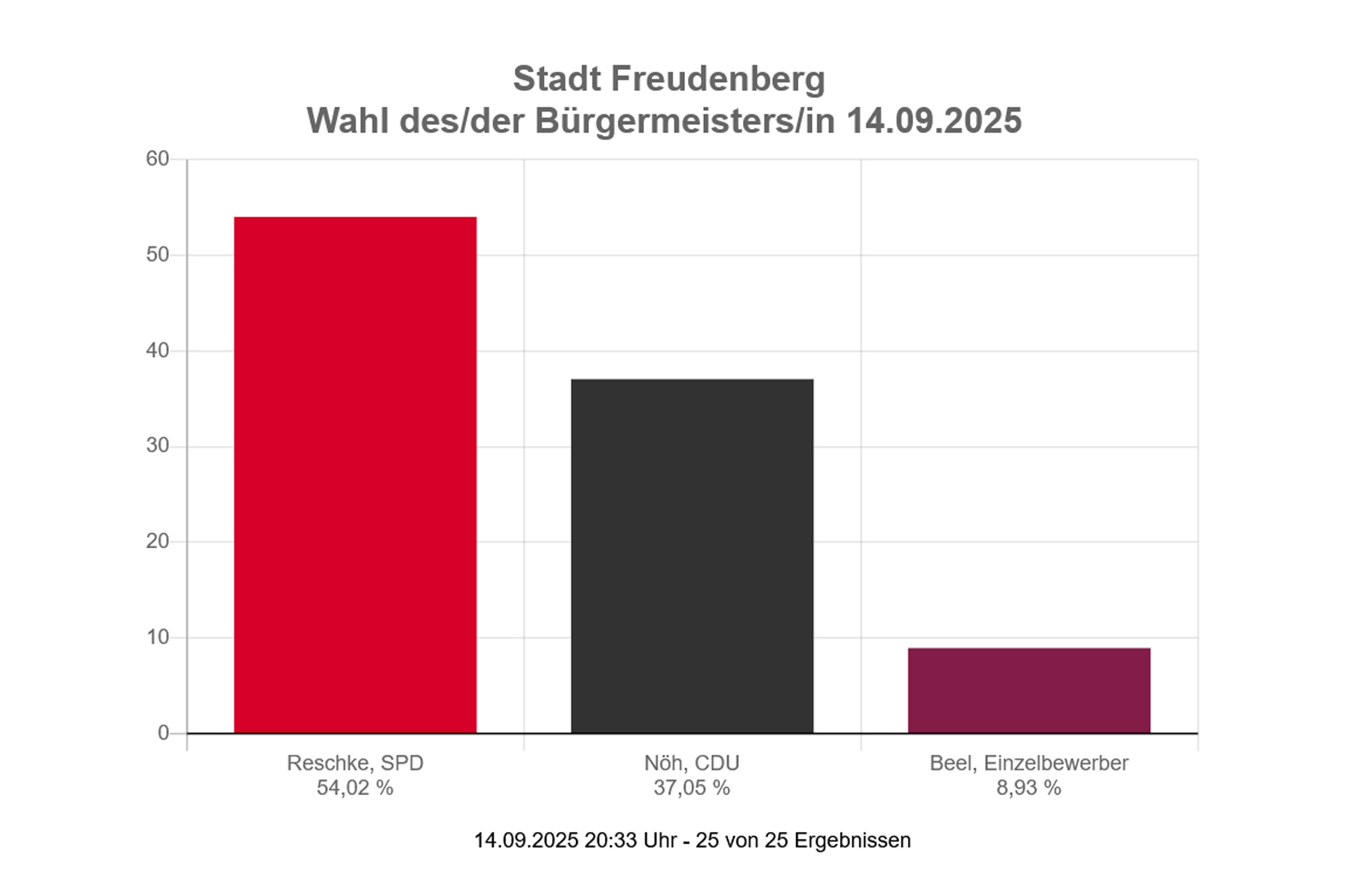 Bei der Bürgermeisterwahl liegt Nicole Reschke nach 19 von 25 Wahlbezirken mit 54,89 % vorne. Timo Nöh kommt derzeit auf 36,29 %. Aber die "großen" Stimmbezirke, unter anderem Freudenberg 1, 2 und 5 sowie Büschergrund 1 und 2 fehlen noch.