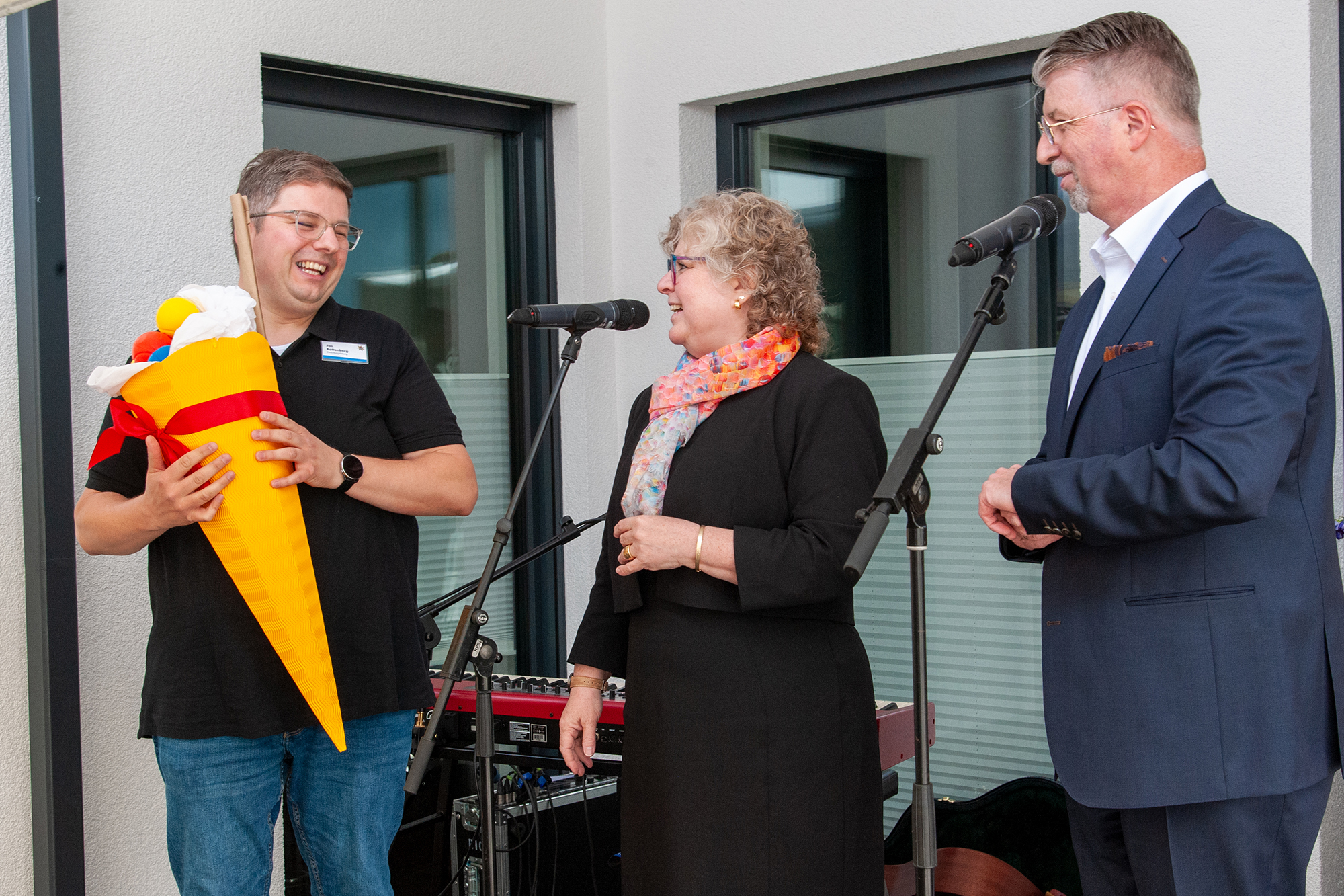 „Viel Freude, kurze Nächte und ein intensiver Austausch" – so skizzierte Architekt Philipp Halbach die Planungen des Neubauprojekts und skizzierte anschließend dessen Werdegang. Dabei präsentierte Halbach einige beeindruckende Zahlen: „4000 Quadratmeter Mauerwerk sind zu bestaunen, knapp 300 Türen und über 3000 Meter Fußleisten." Viel wichtiger sei für ihn als Architekt jedoch teilzuhaben an der Gestaltung von Arbeits- und Lebensräumen, in denen sich Menschen wohlfühlen und diese als lebenswert erachten. Sein Dank galt allen an der Planung und Ausführung Beteiligten, die gemeinsam einen Neubau erschaffen hätten, der auch etwas Stolz machen dürfe.